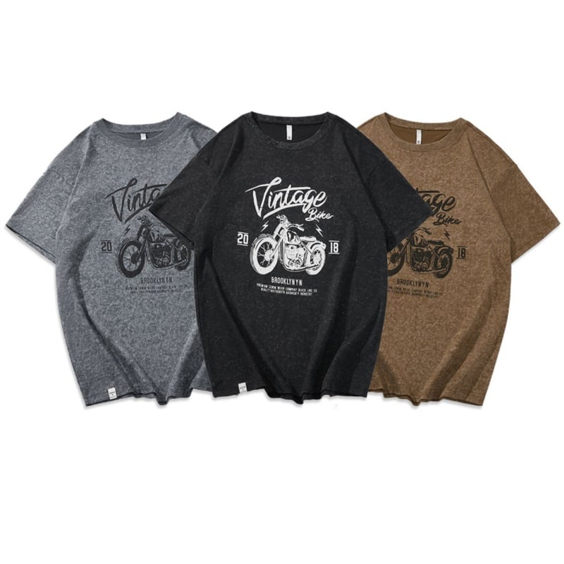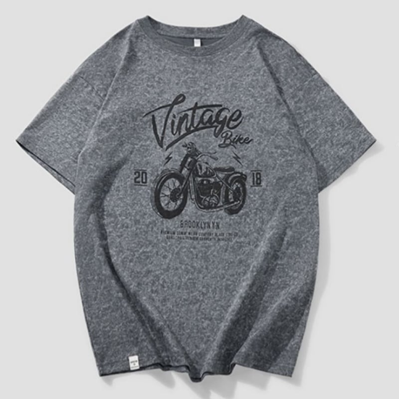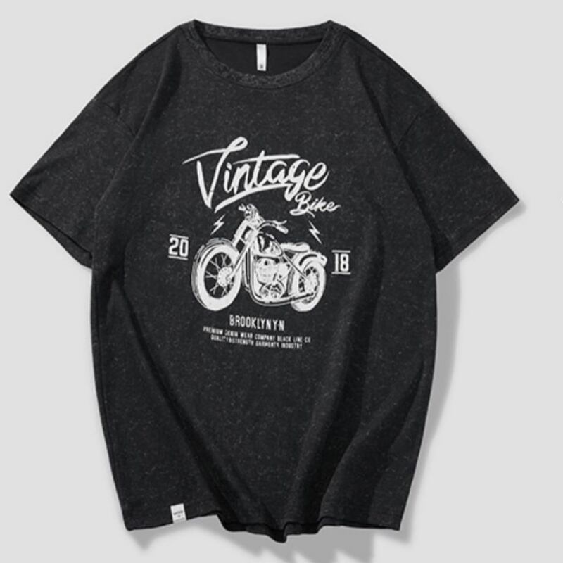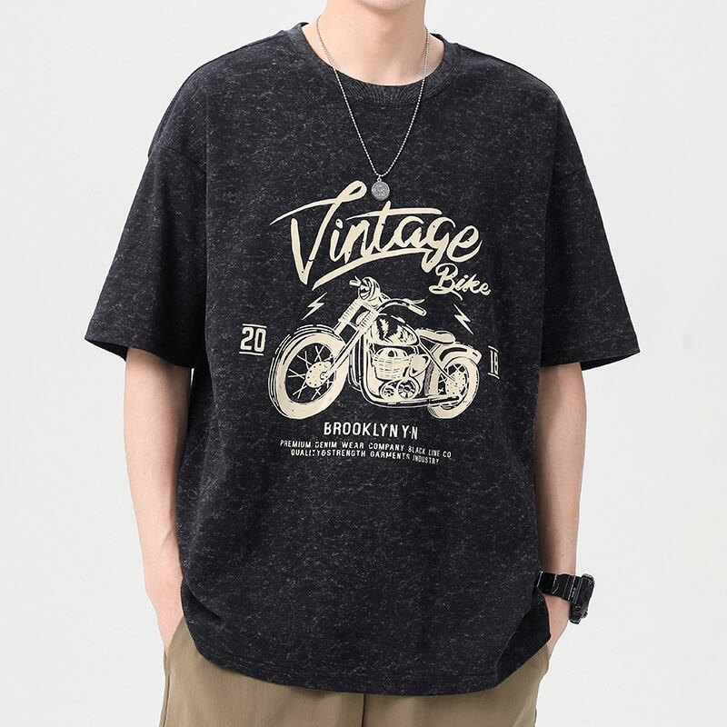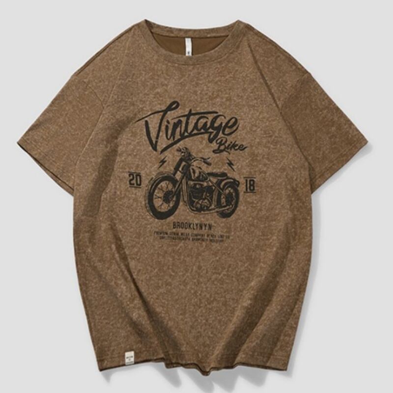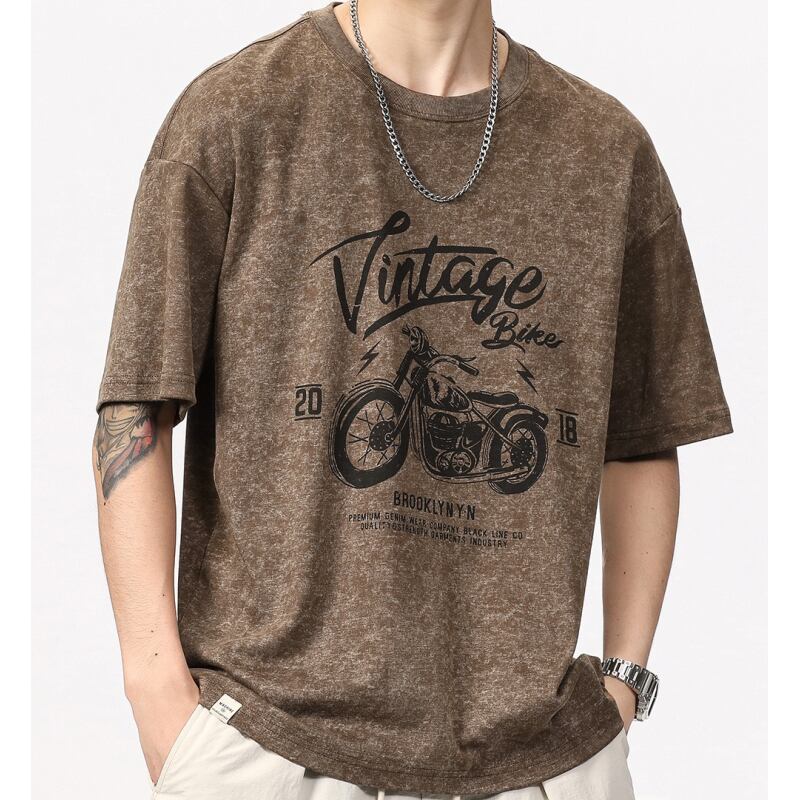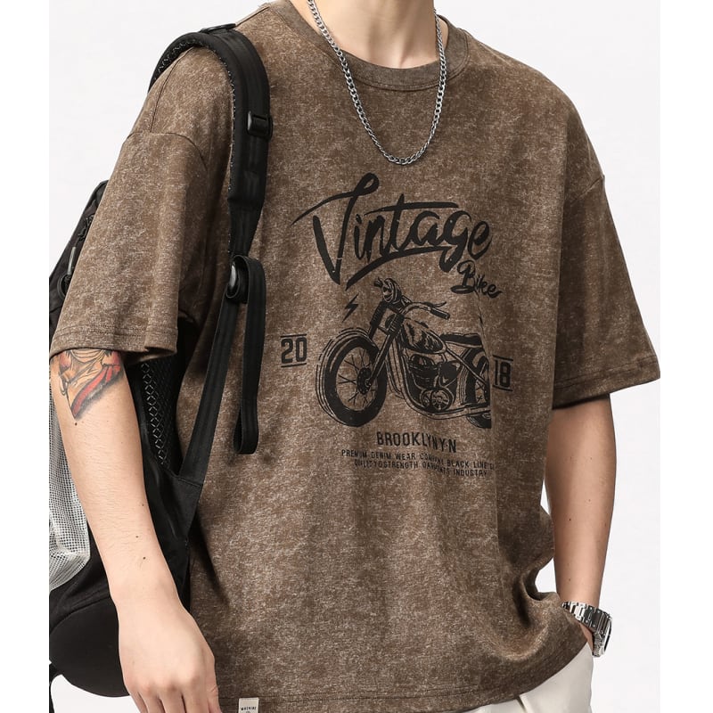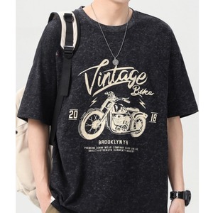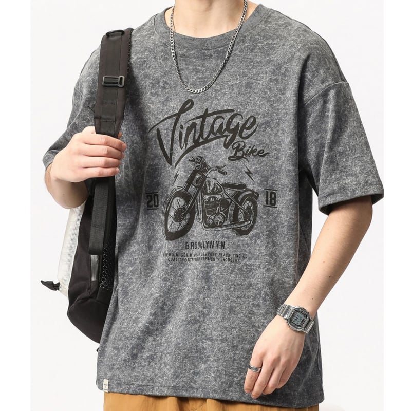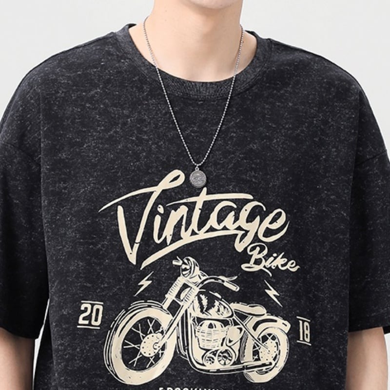 ヴィンテージ風のバイクグラフィックが目を惹く、オーバーサイズの半袖Tシャツです。