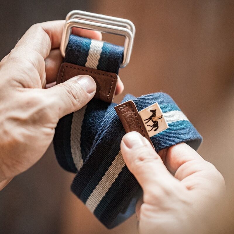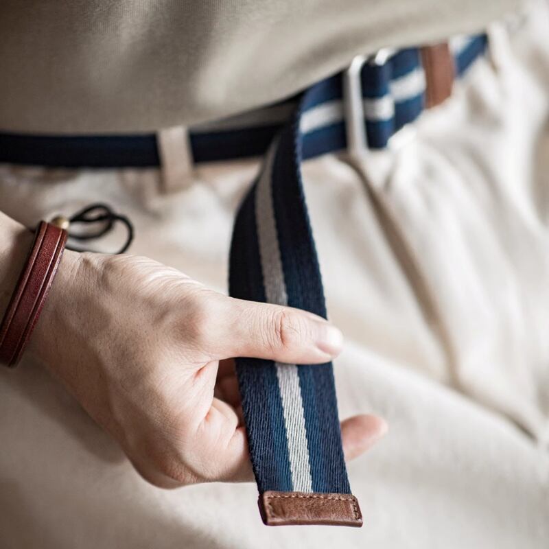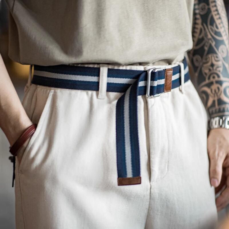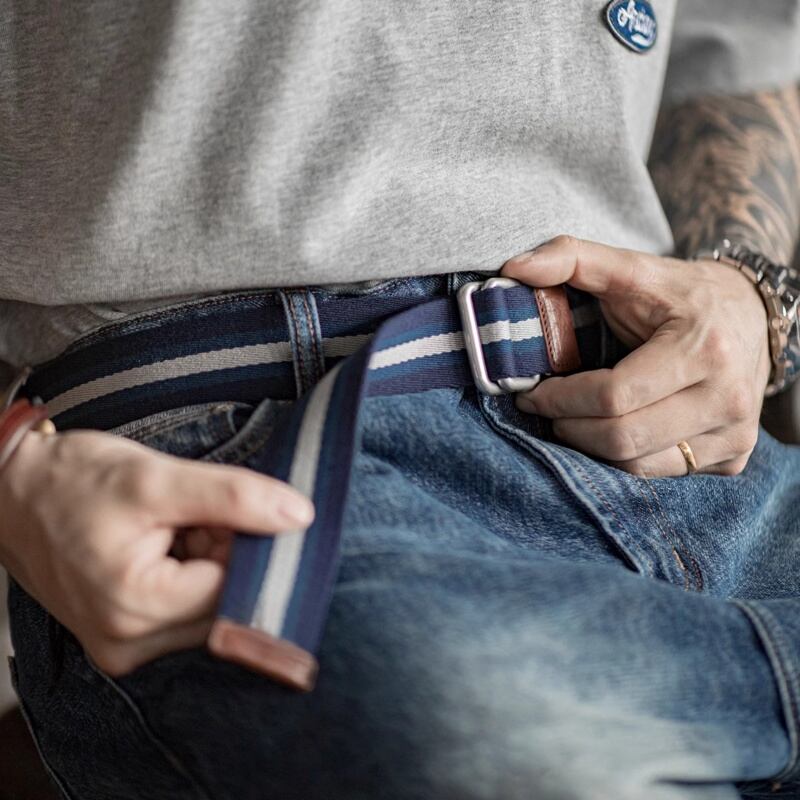 丈夫なキャンバスと本革のアクセントが魅力の、ダブルリングバックルキャンバスベルトです。
