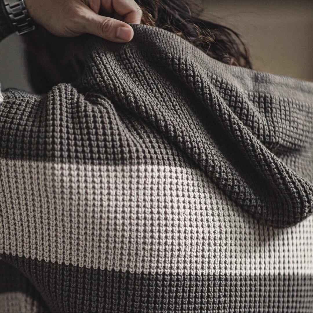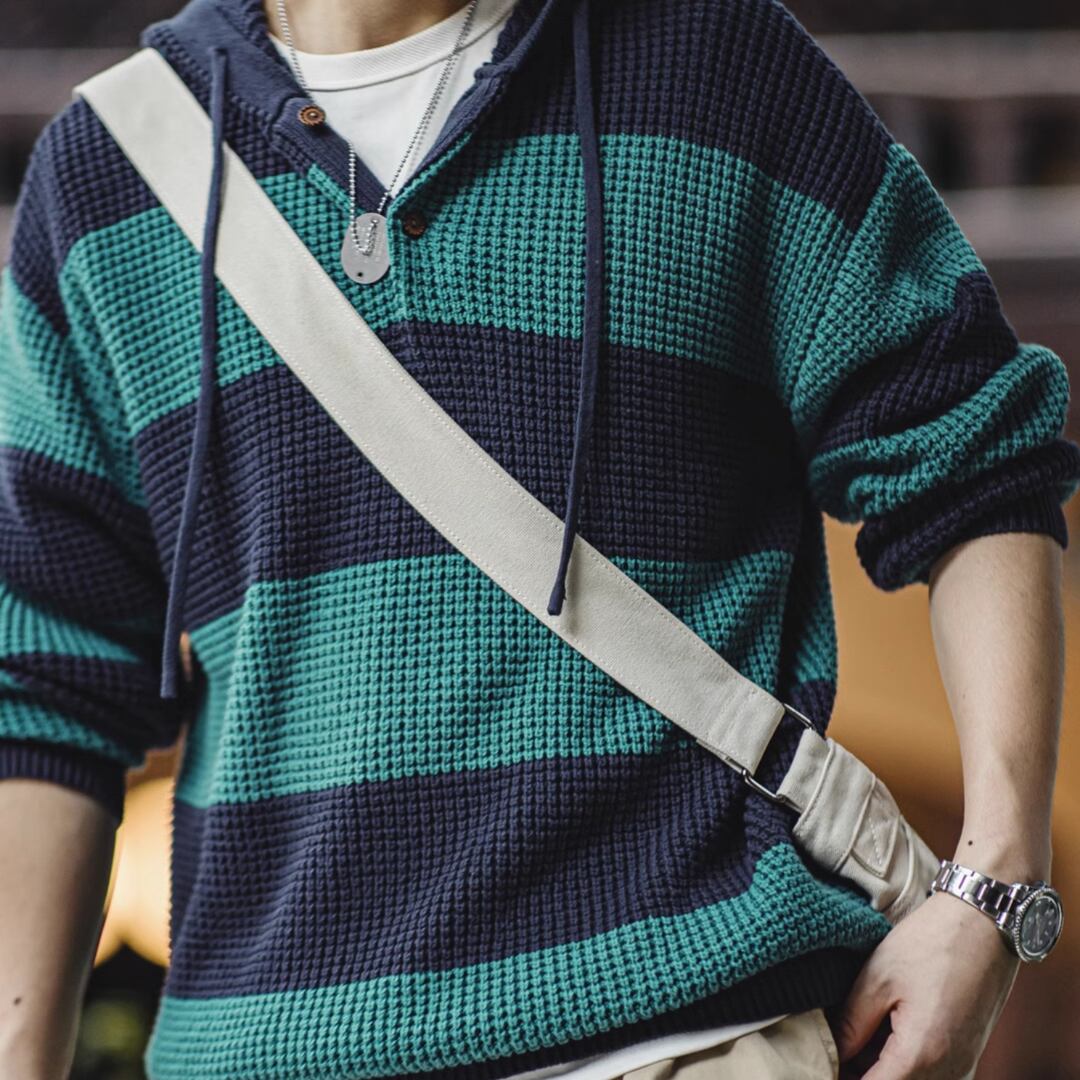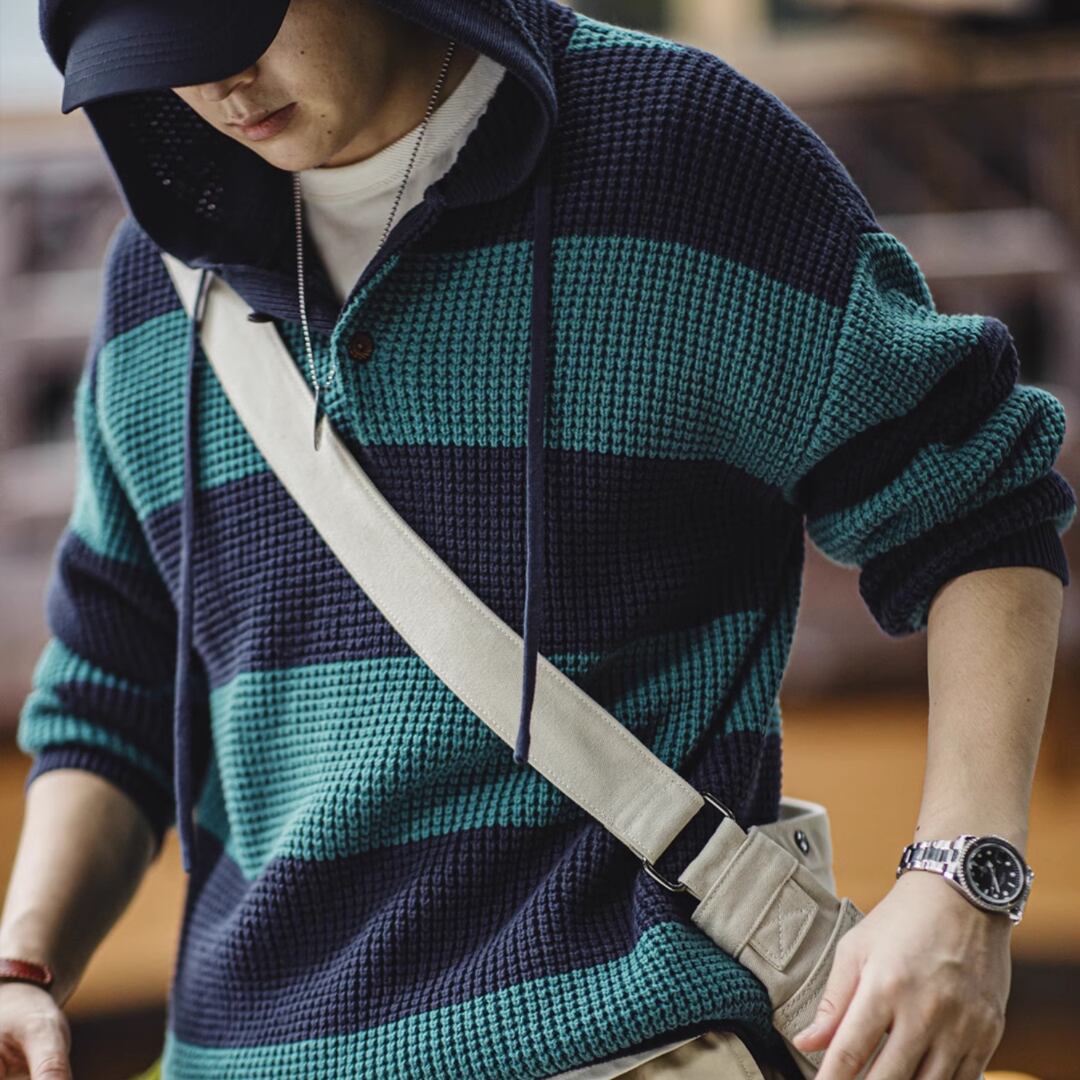 このセーターは、アメリカンカジュアルなデザインが特徴で、バイカラーのストライプがアクセントとなり、シンプルながらおしゃれです。