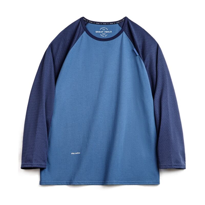 ブルーのコントラストカラーが爽やかなメッシュスリーブのロングTシャツです。
