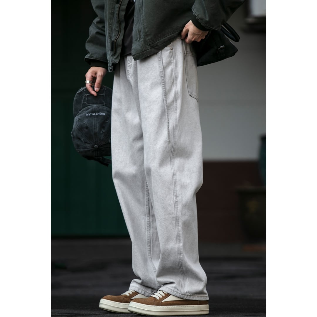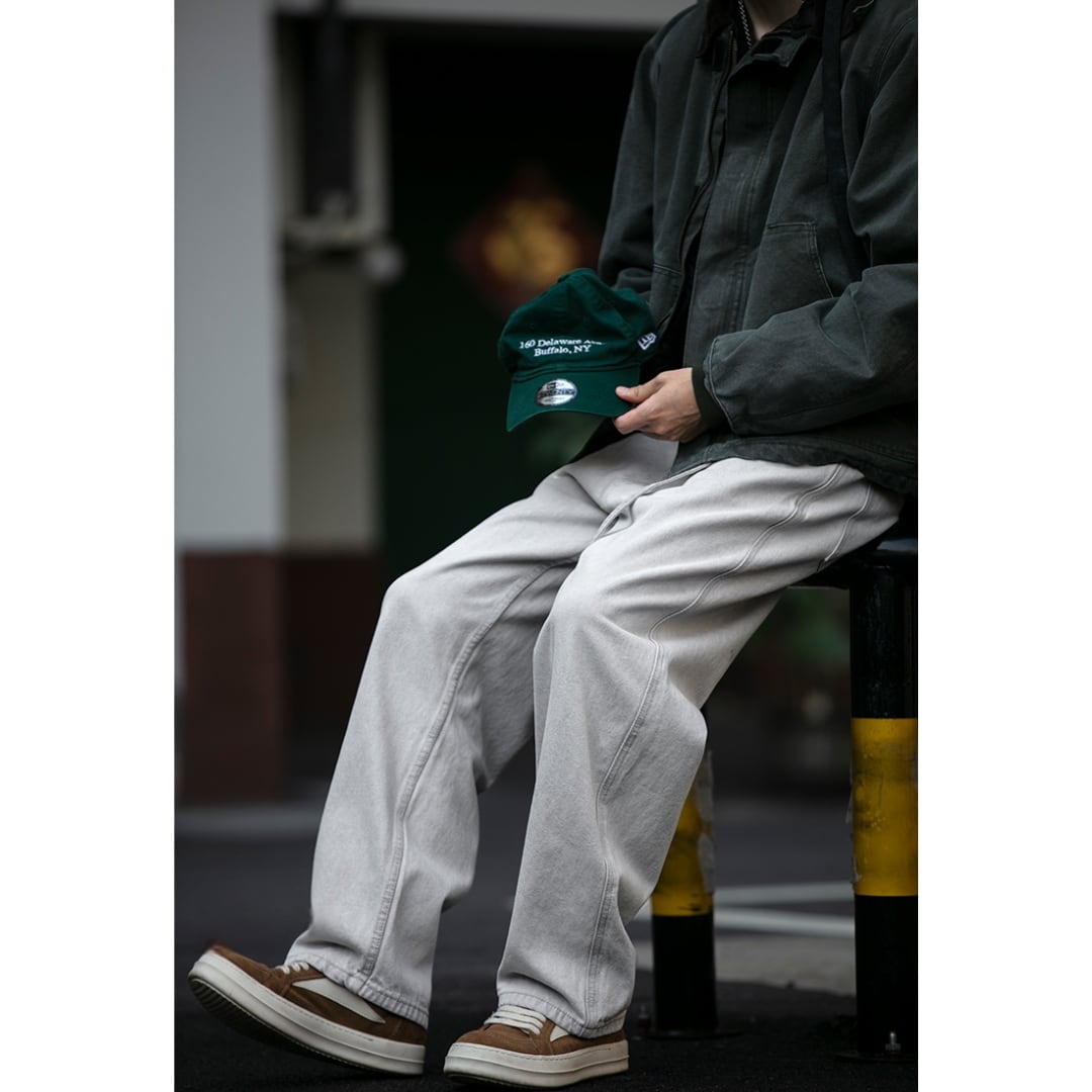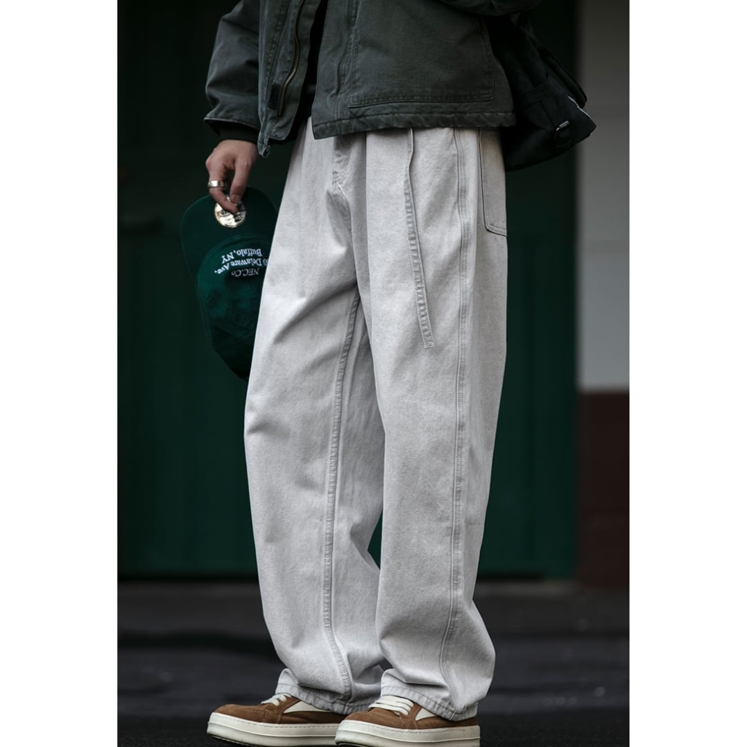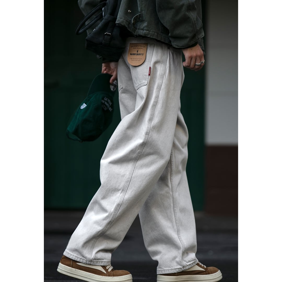 ルーズフィットでありながら、ワイドレッグシルエットが洗練された印象を与える。