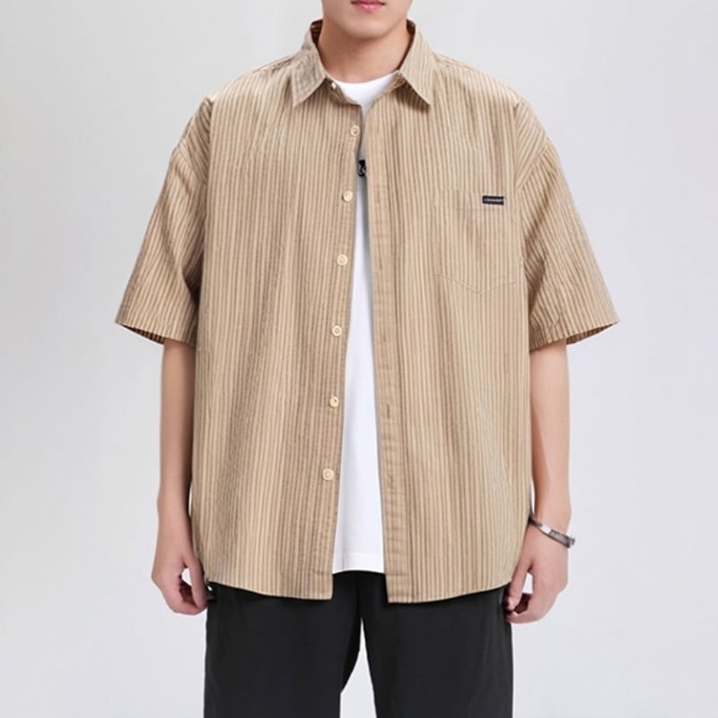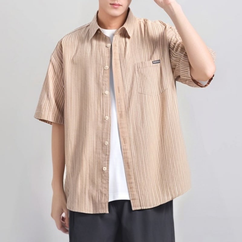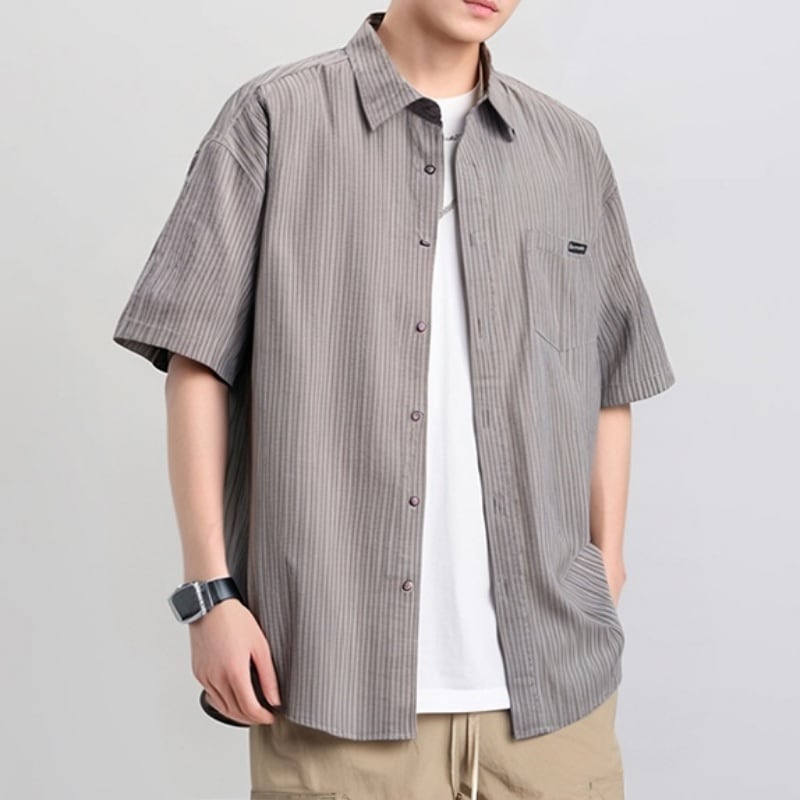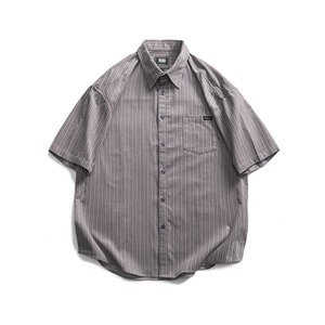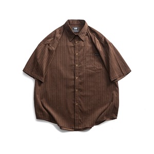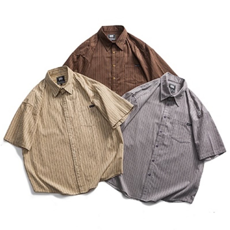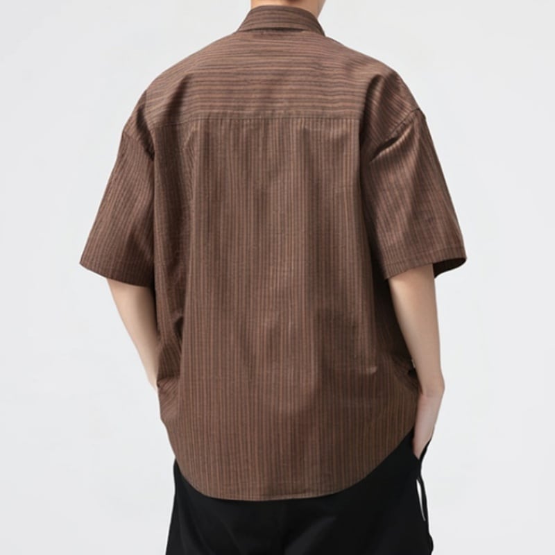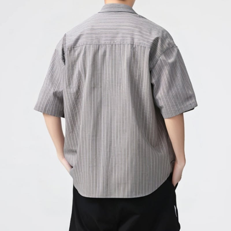 シンプルで洗練されたストライプ柄が魅力の半袖ラペルシャツです。