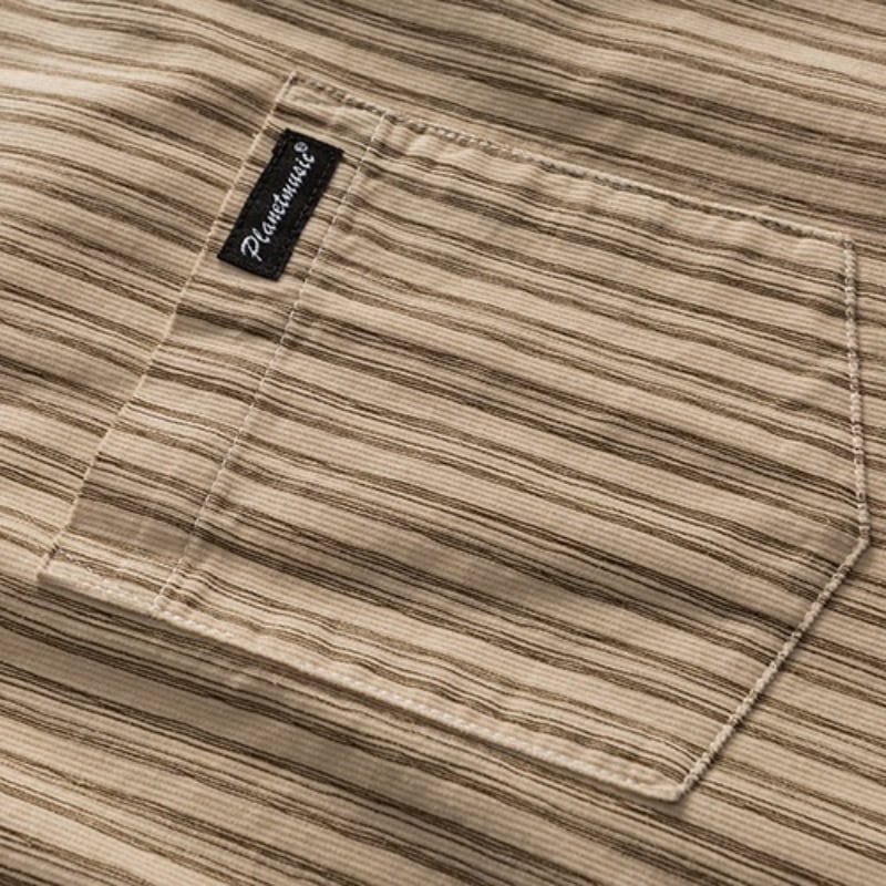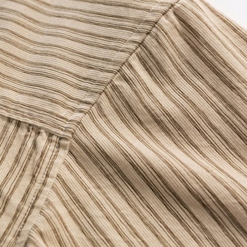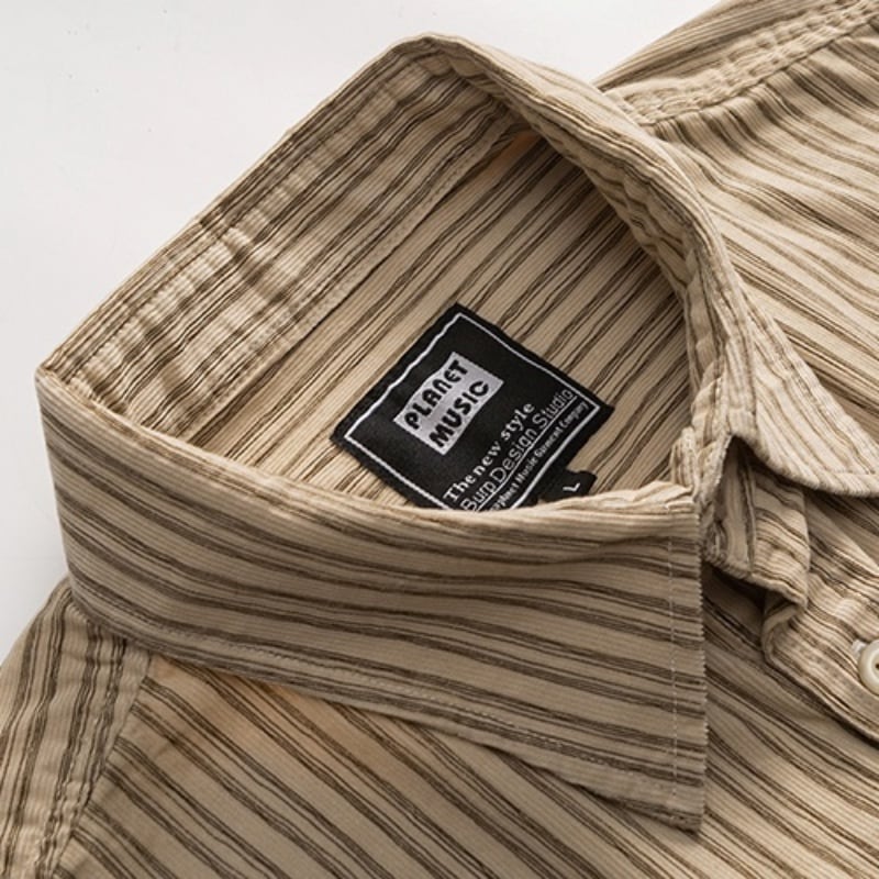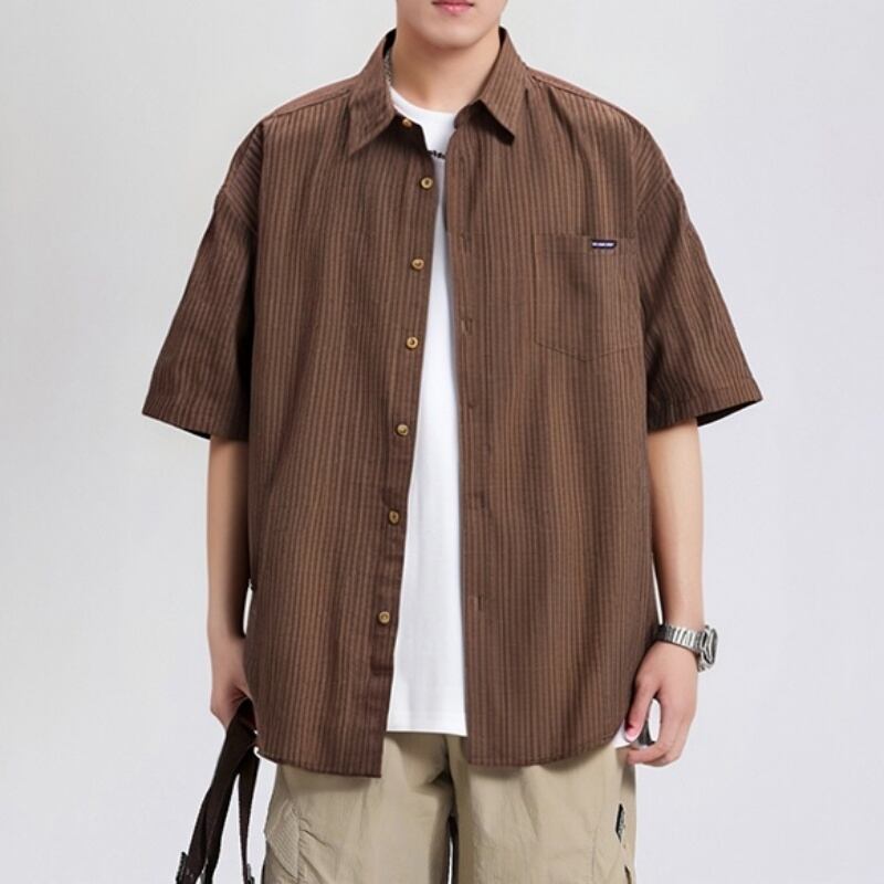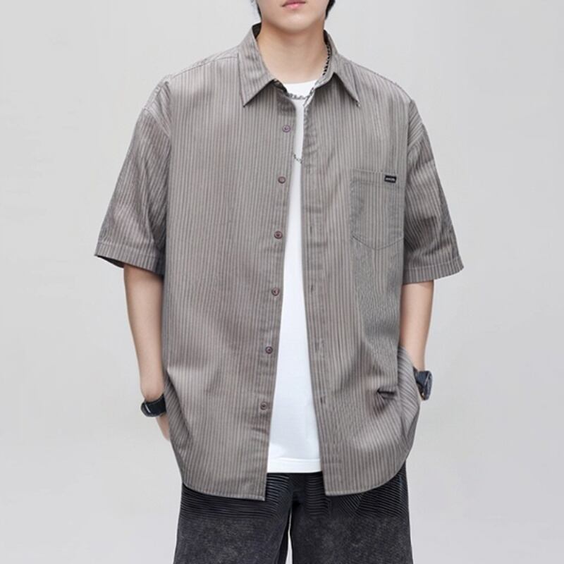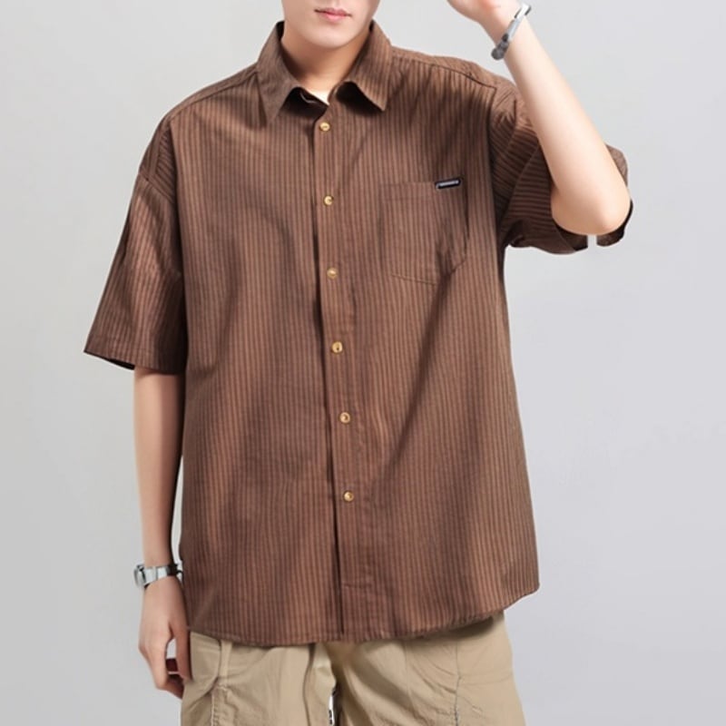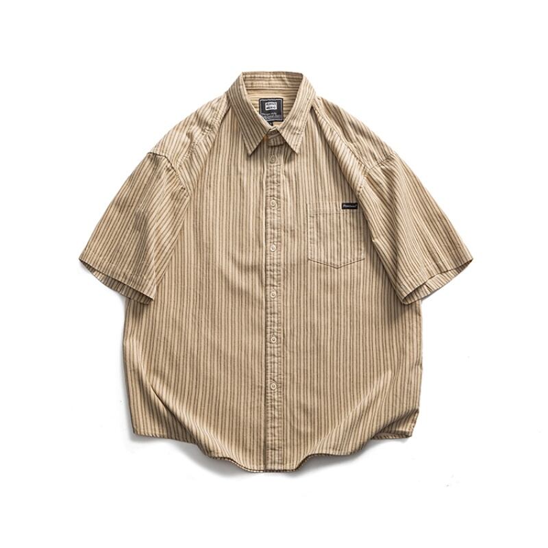 シンプルで洗練されたストライプ柄が魅力の半袖ラペルシャツです。