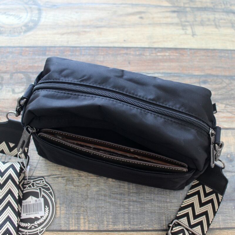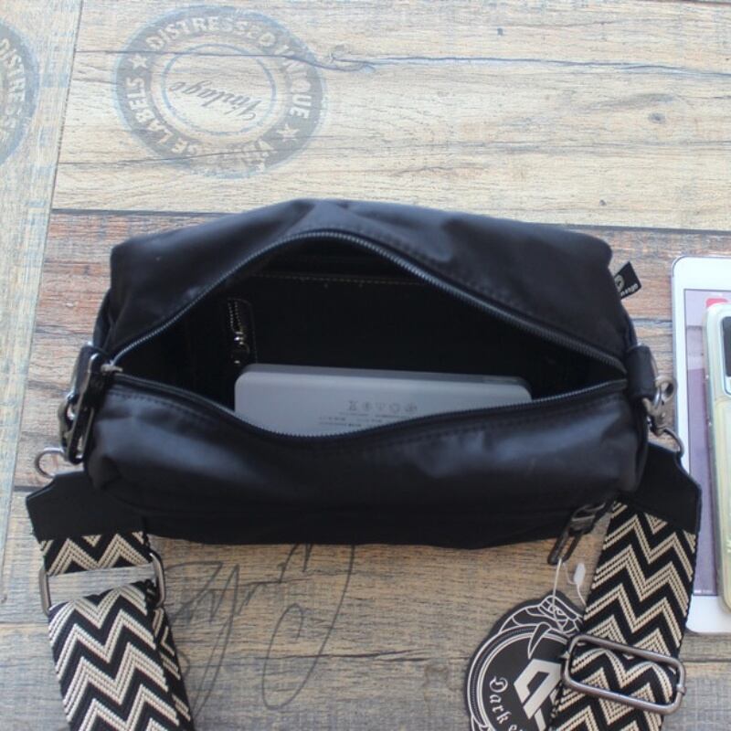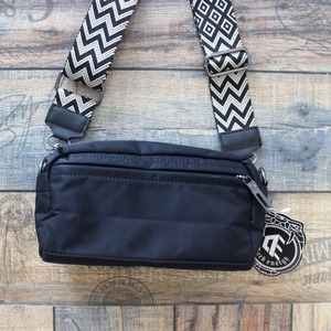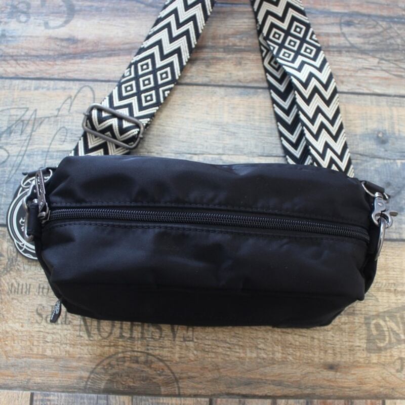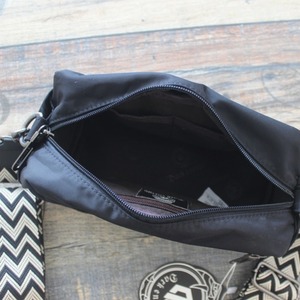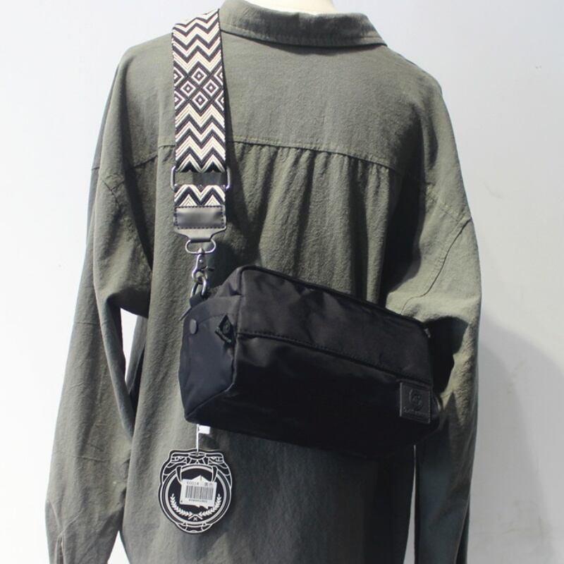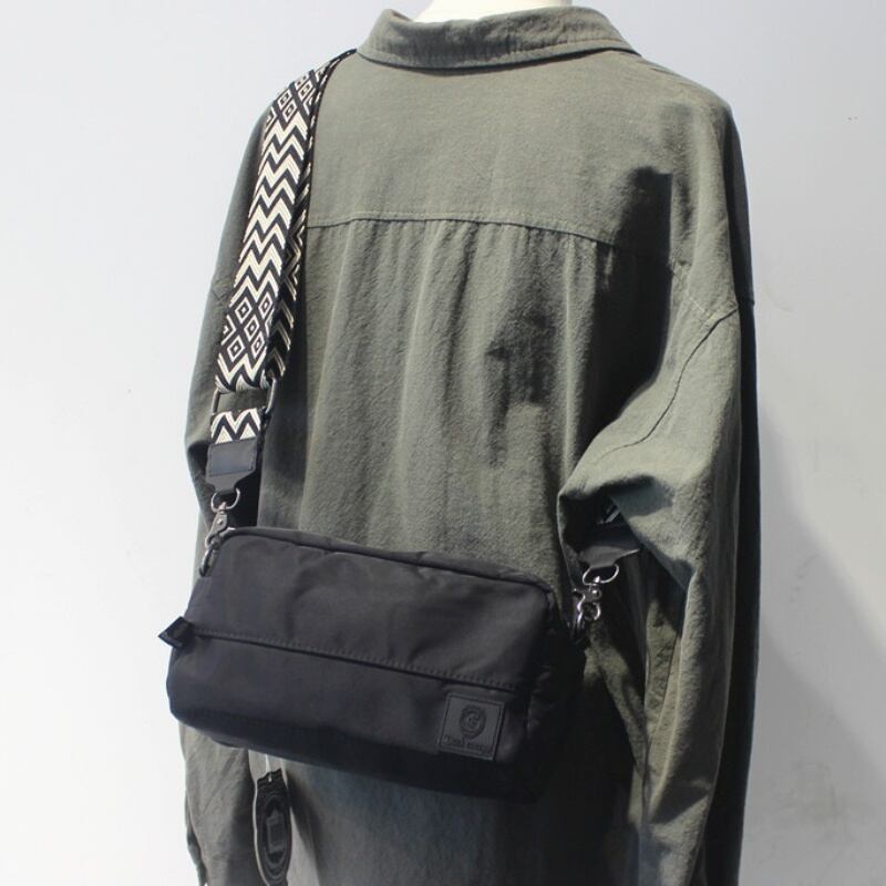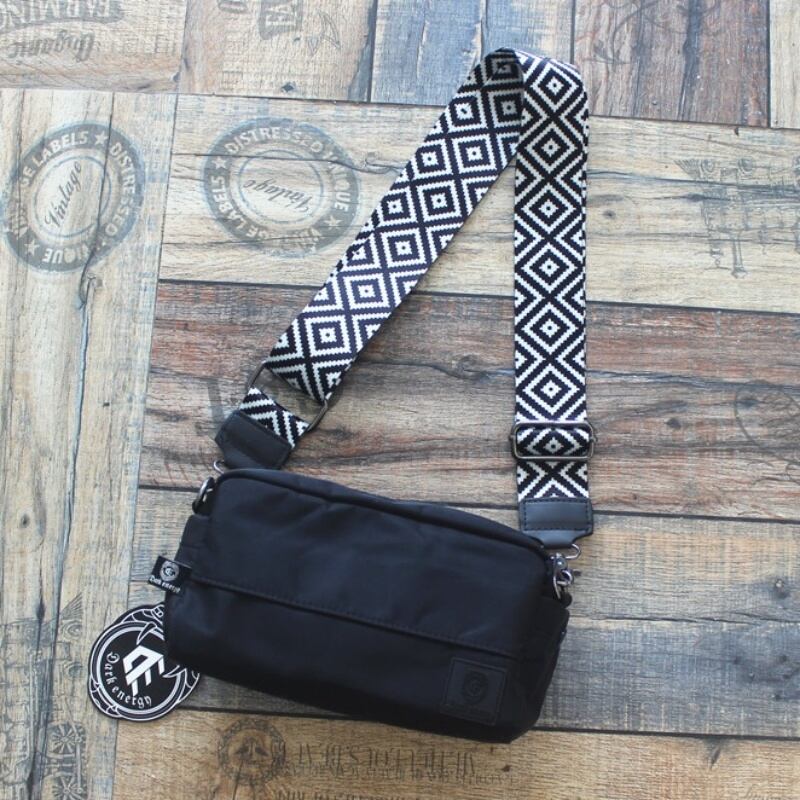 幾何学模様のショルダーストラップが目を惹く、コンパクトなショルダーバッグです。