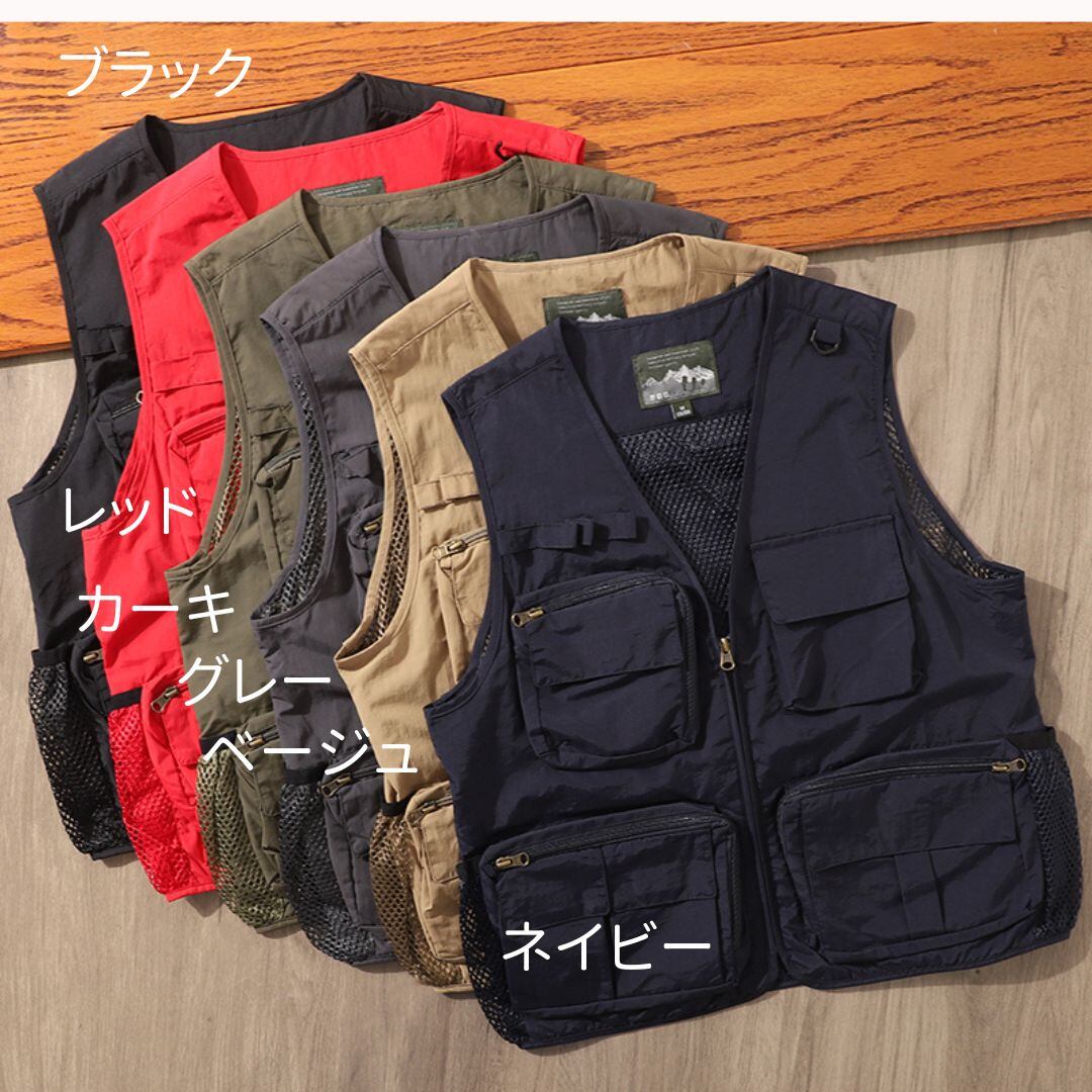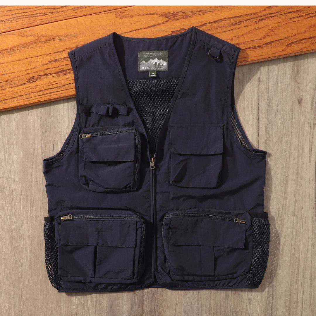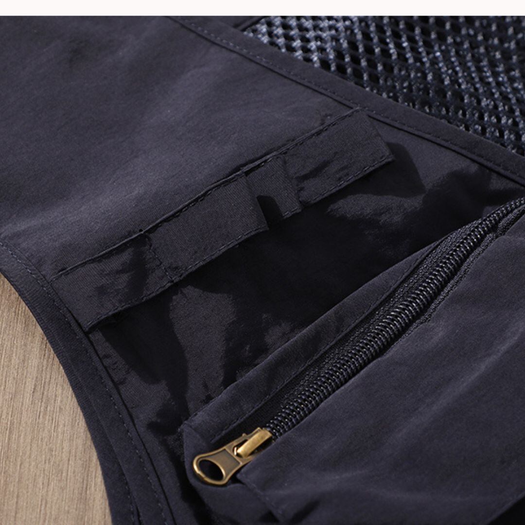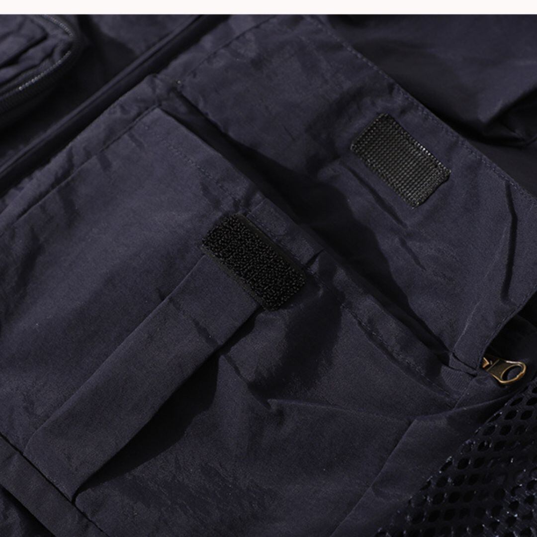 V字ネックのノースリーブベストは、メッシュパネルとマルチポケットが特徴です。