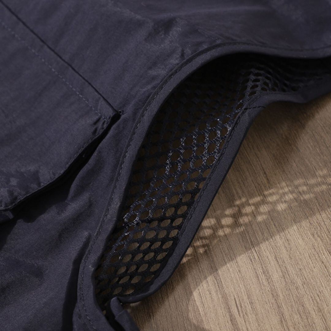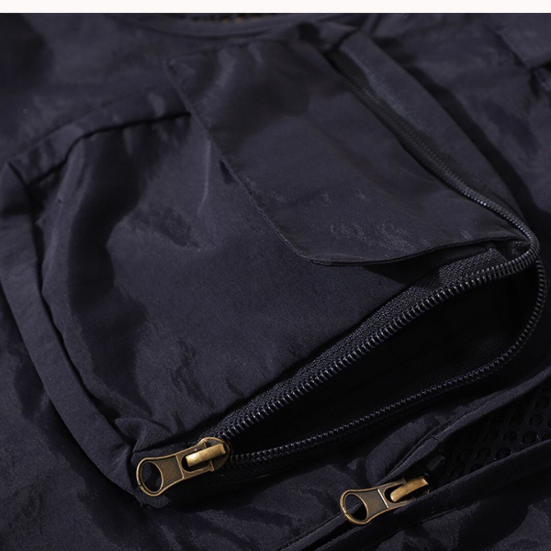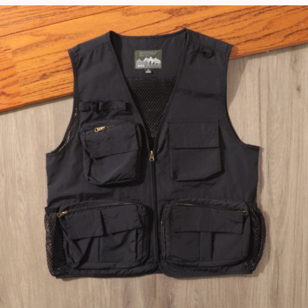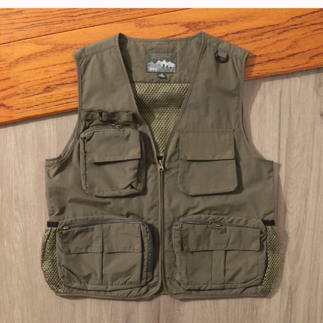 V字ネックのノースリーブベストは、メッシュパネルとマルチポケットが特徴です。