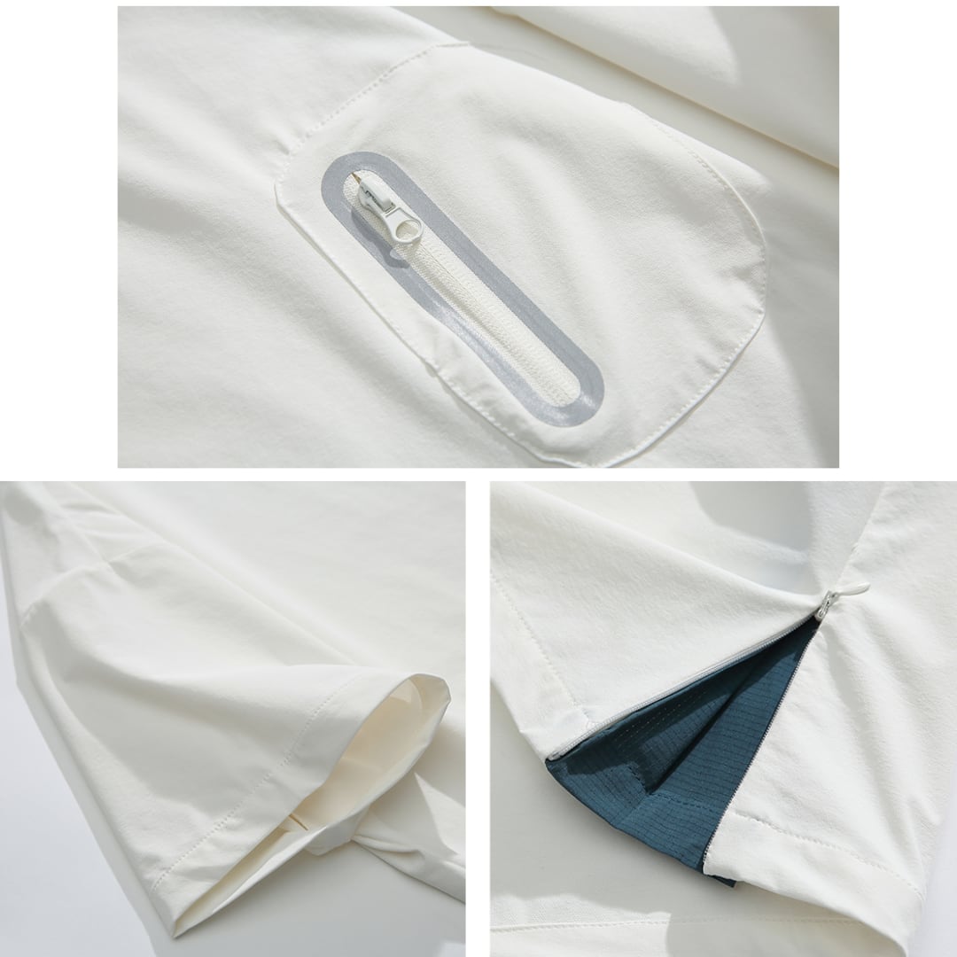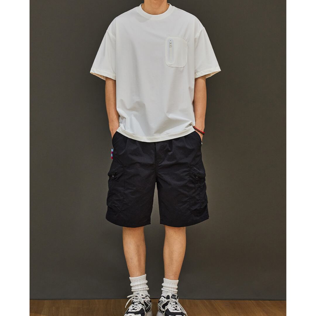 シンプルなデザインながら、胸元のジッパー付きポケットがさりげないアクセントになっています。