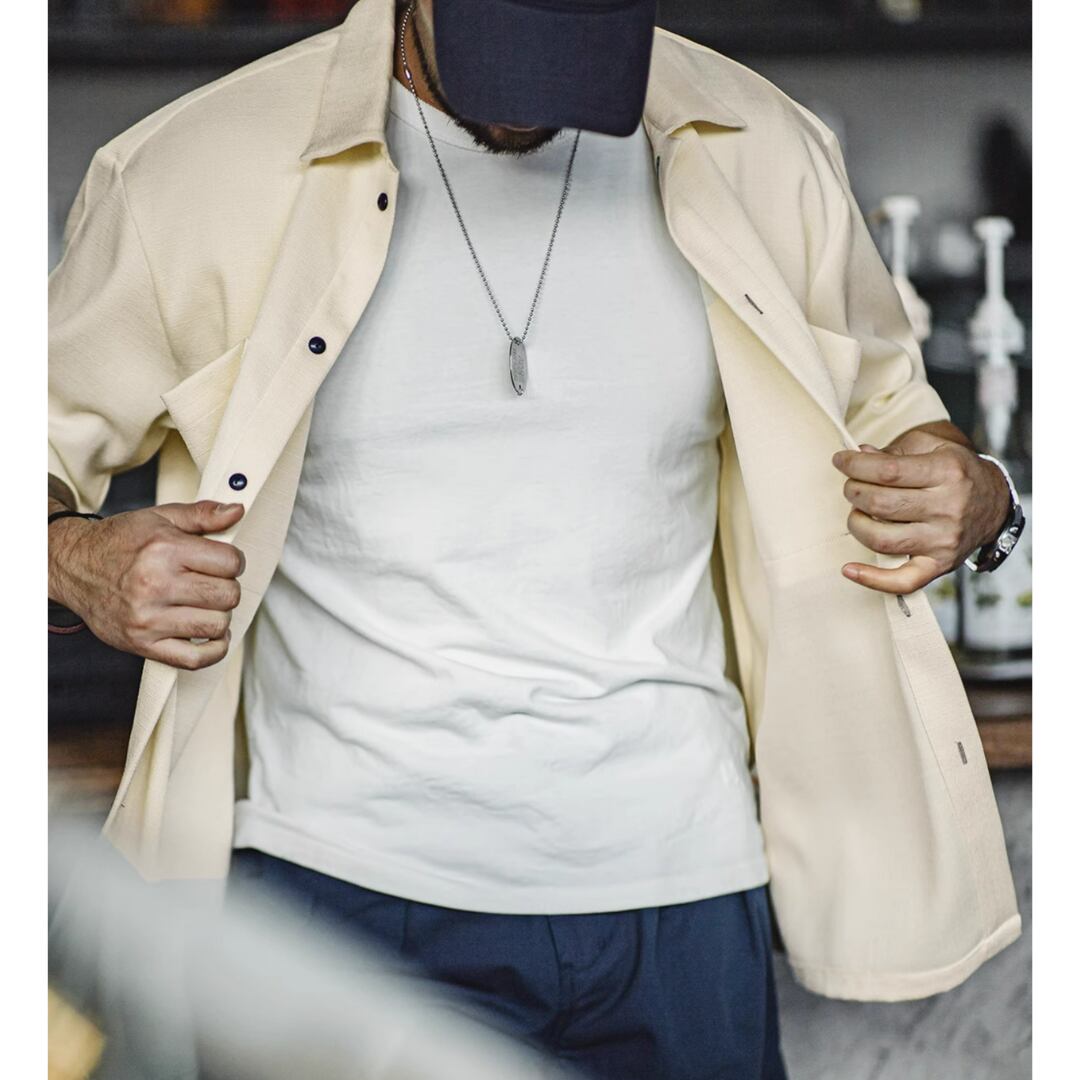 シンプルなデザインながら胸元の大きめのパッチポケットがアクセントとなり、着こなしにこなれ感をプラスします。