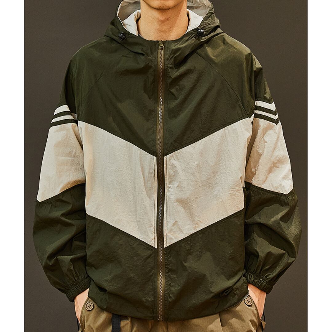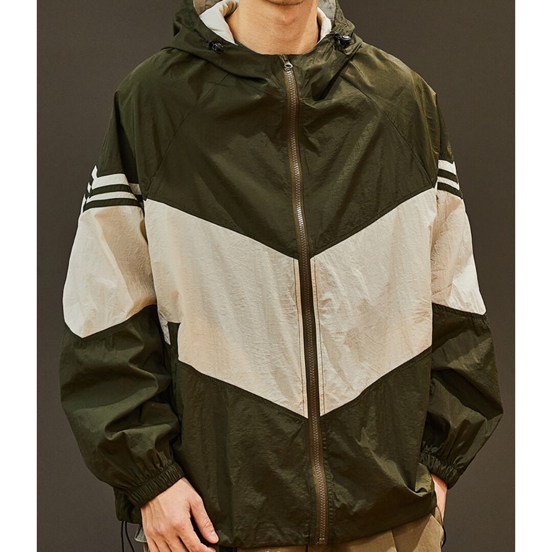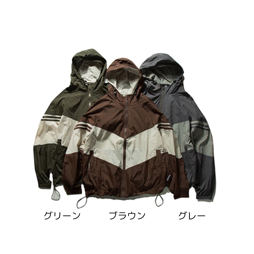 バイカラー切り替えデザインのフード付きジップアップジャケット。