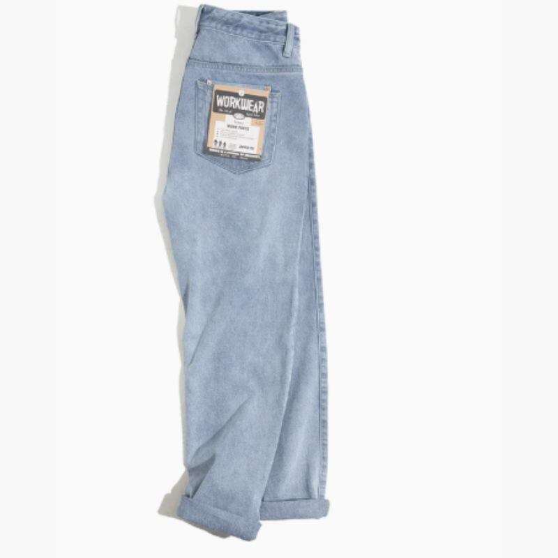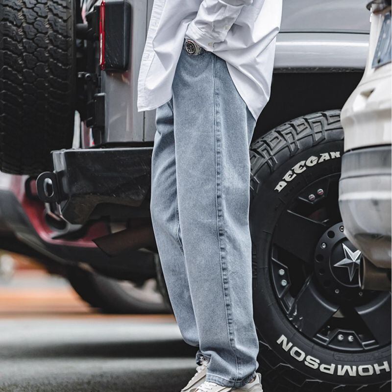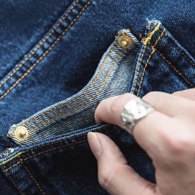 シンプルながらも洗練されたデザインのテーパードデニムパンツ。