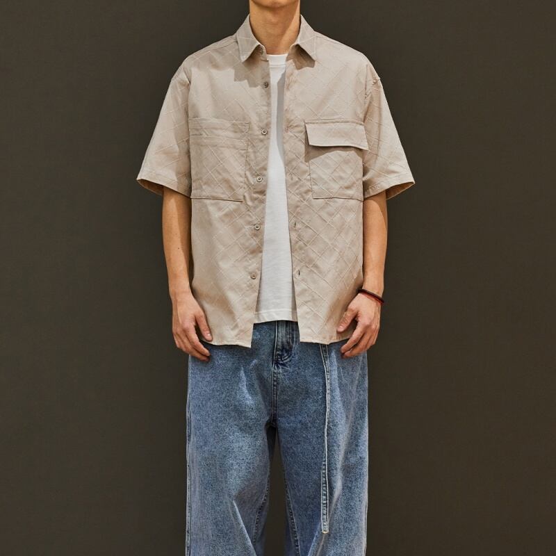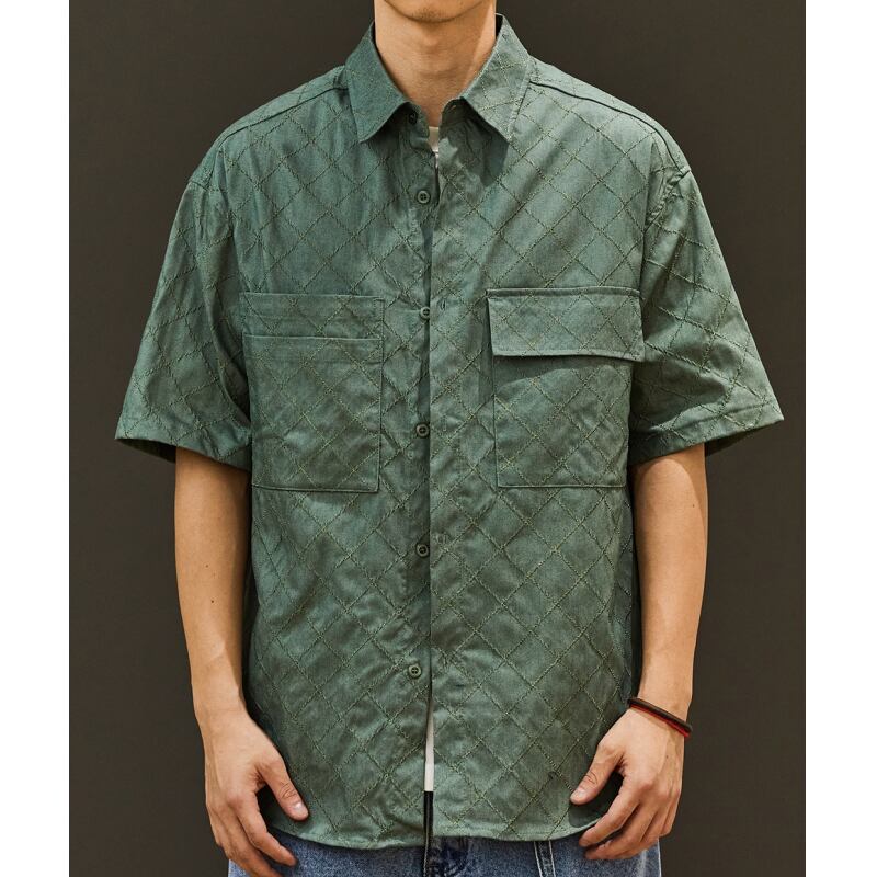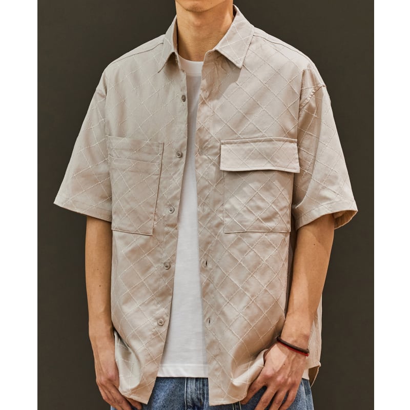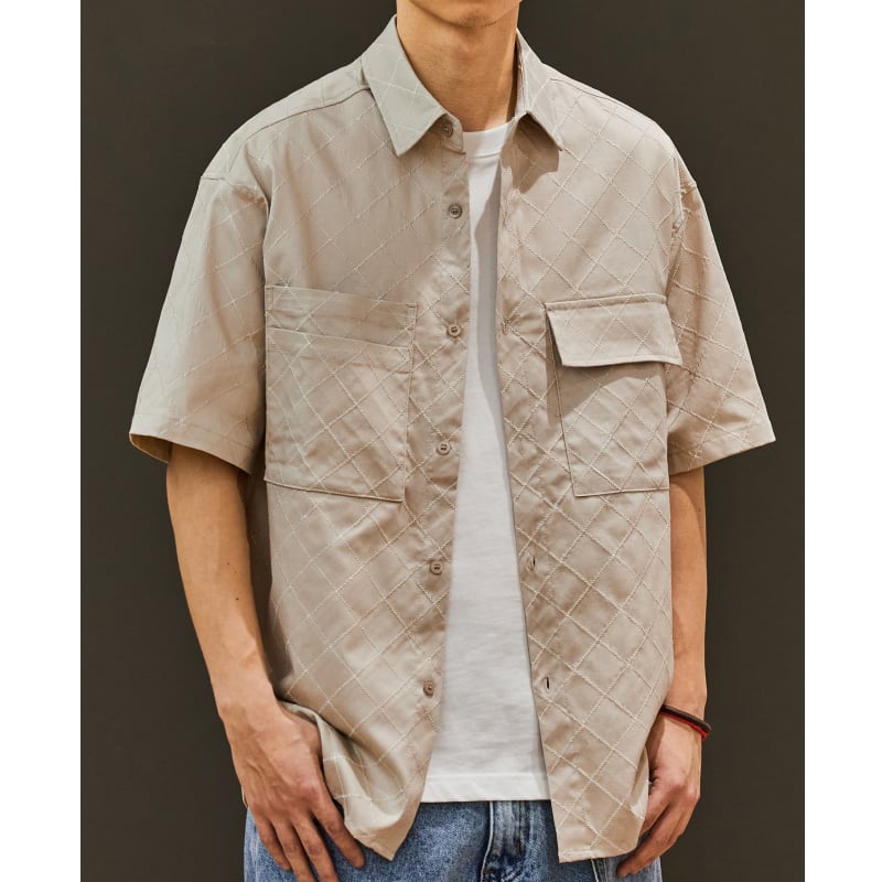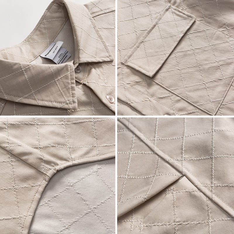 落ち着いたトーンのチェック柄と、ジャカード生地のボタンダウンシャツです。