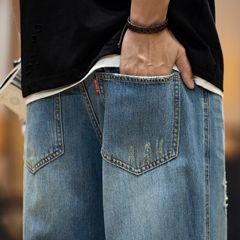 ゆったりワイドレッグのダメージ加工デニムパンツです。