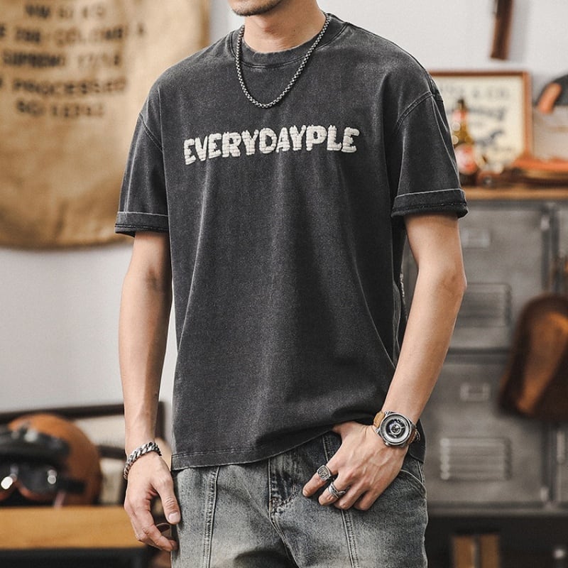 厚手の素材で、ダメージ加工された風合いはレトロでクールな印象に。