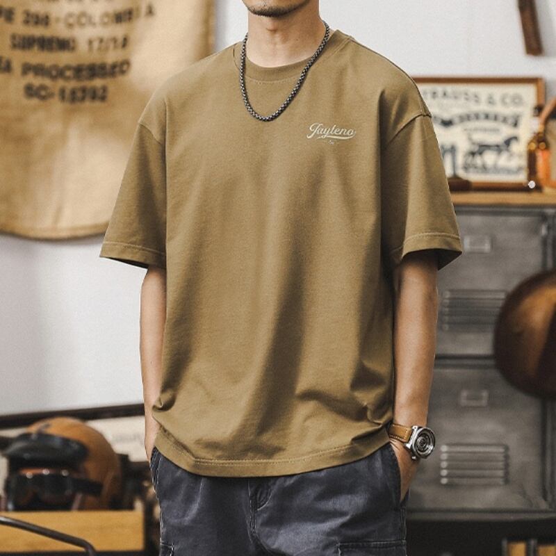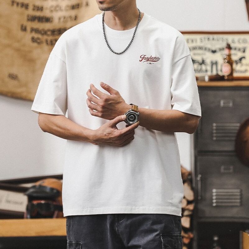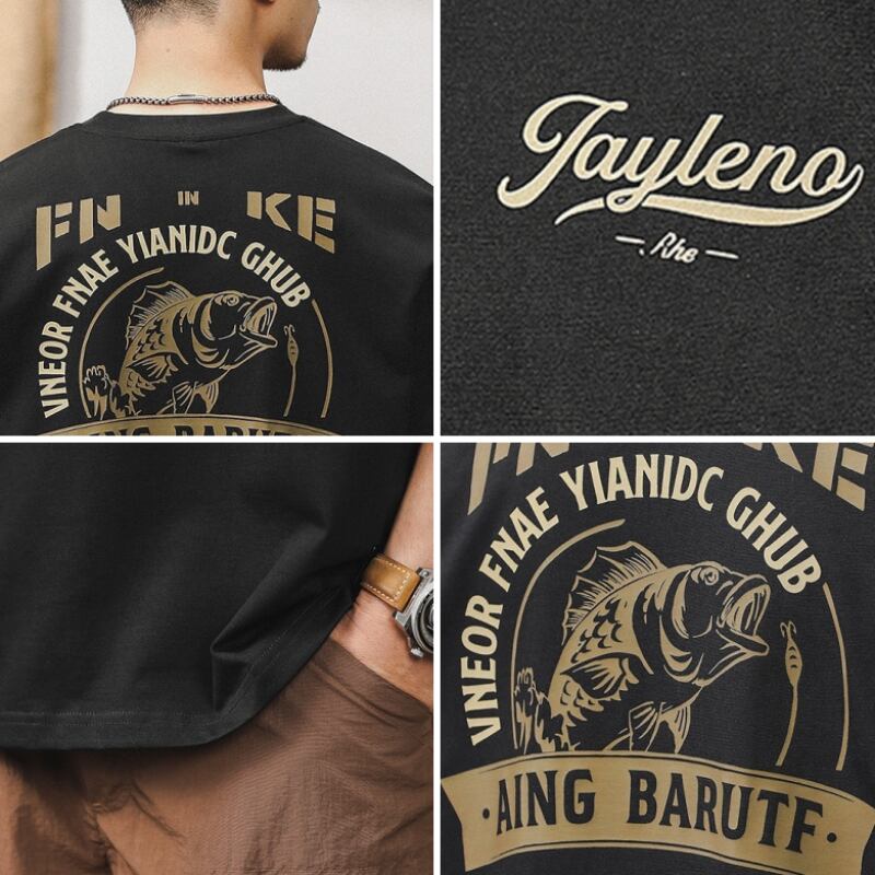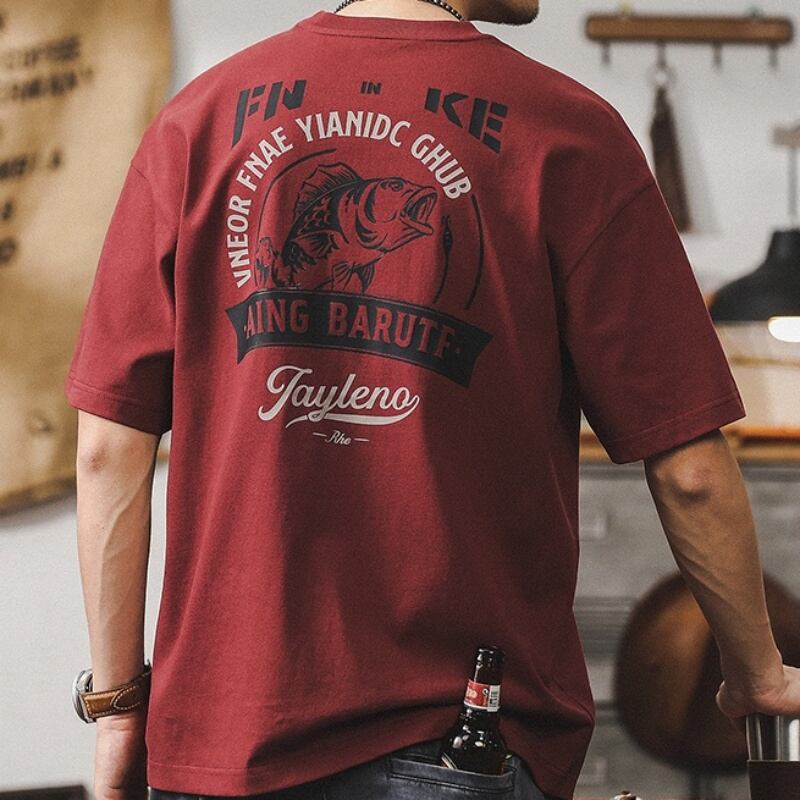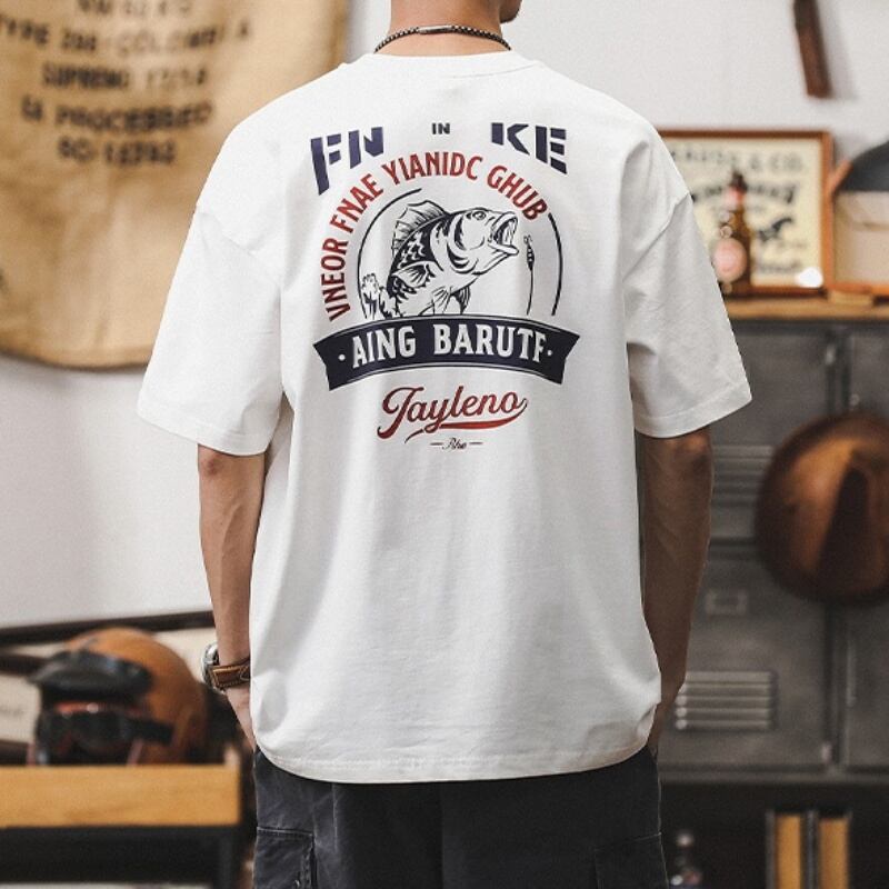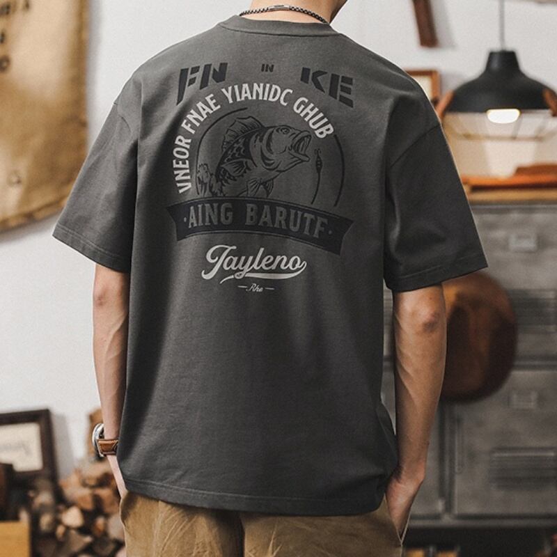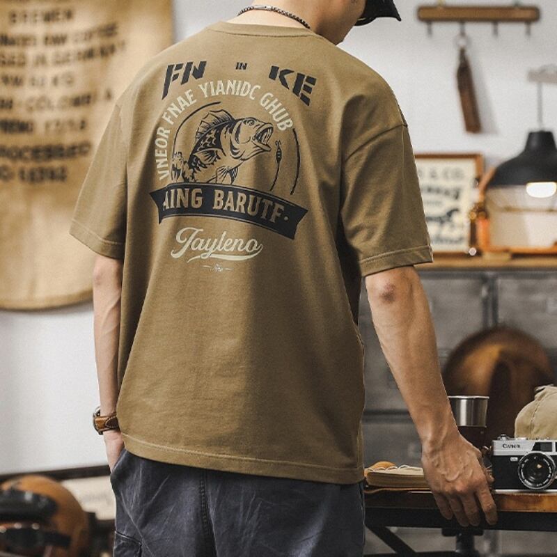 フィッシングデザインのバックプリントがアクセントになった半袖Tシャツです。
