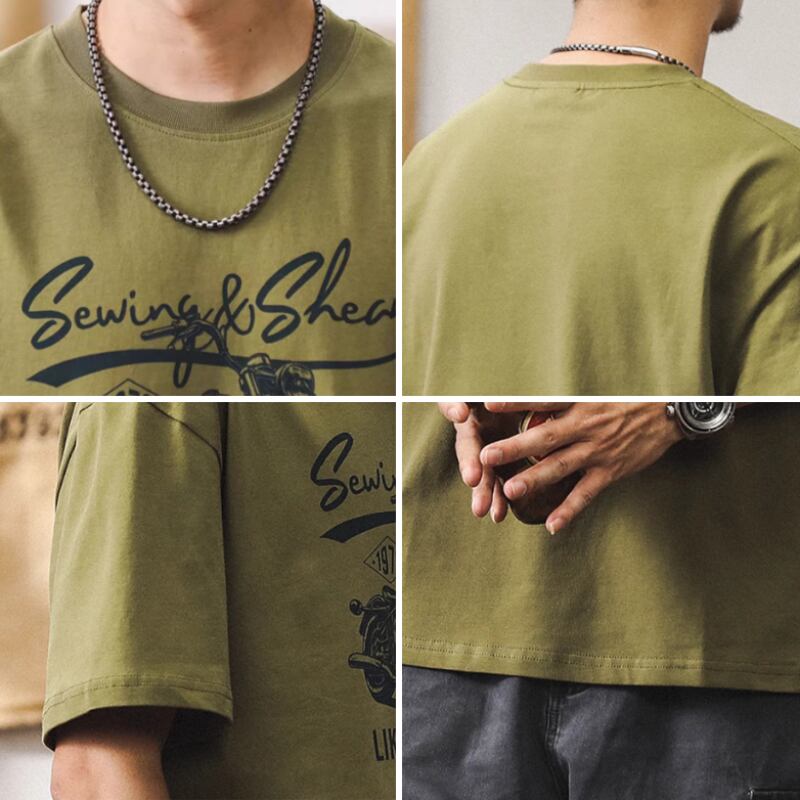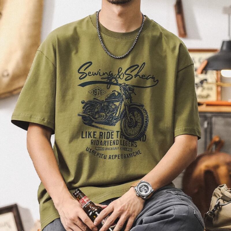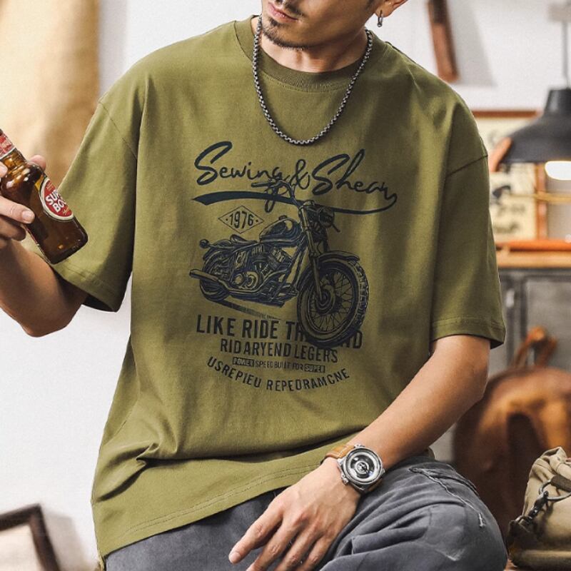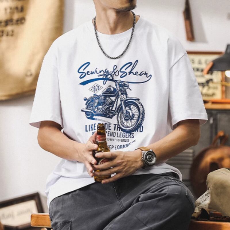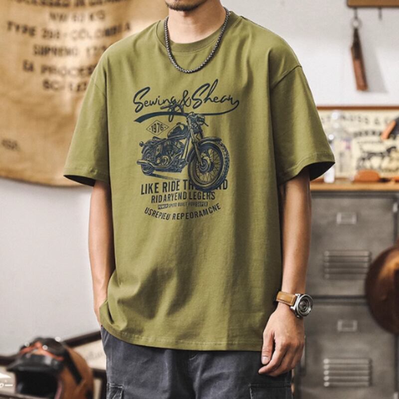ヴィンテージ風のバイクグラフィックが魅力的なクルーネックの半袖Tシャツです。