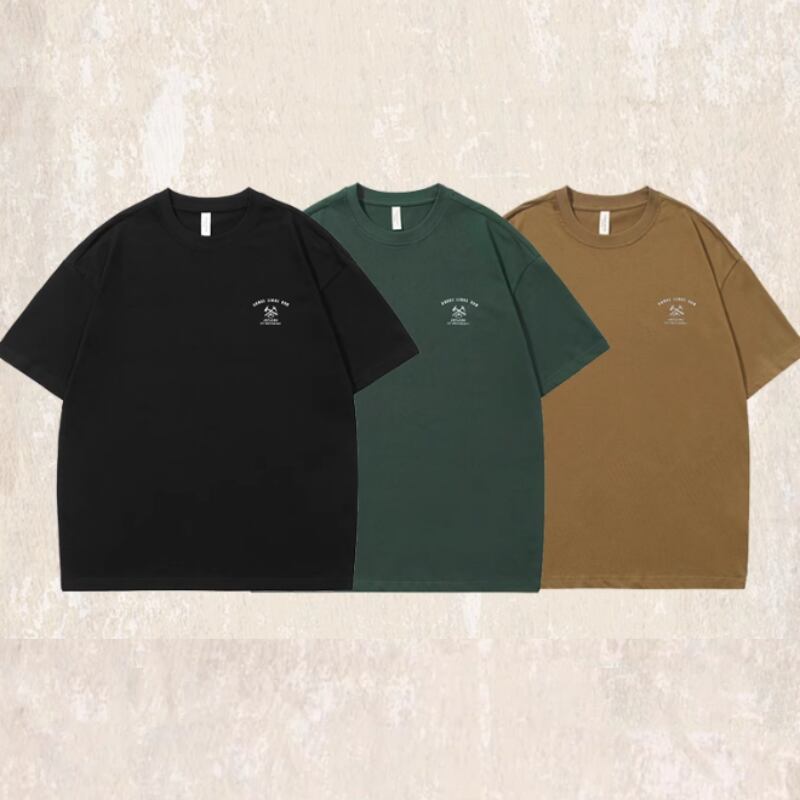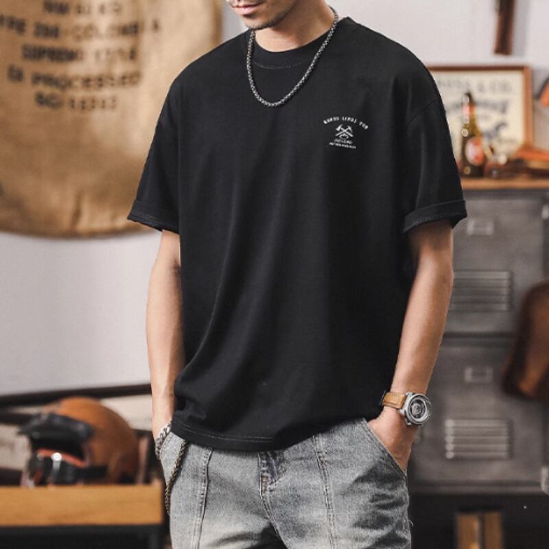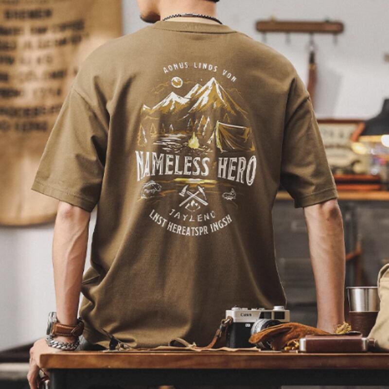 キャンプのバックプリントが目を引く、ゆったりサイズの半袖Tシャツです。