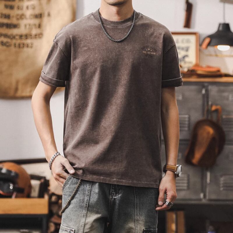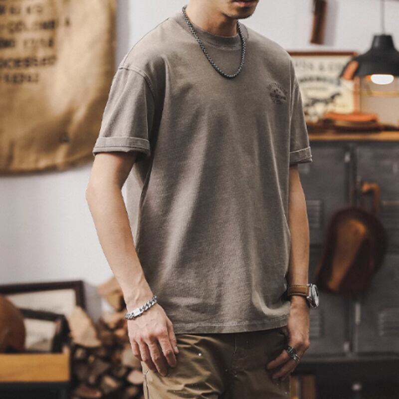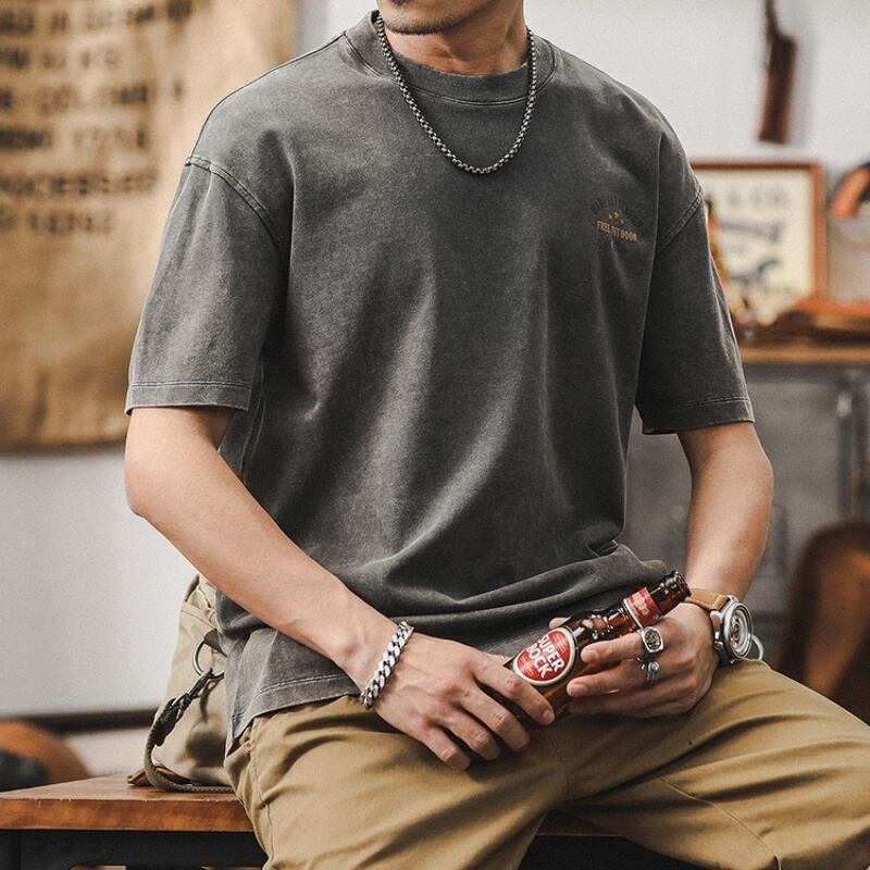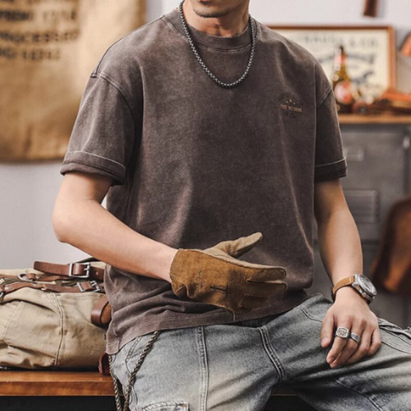 厚手の素材にウォッシュ加工を施し、使い込んだような味のある風合いを演出。