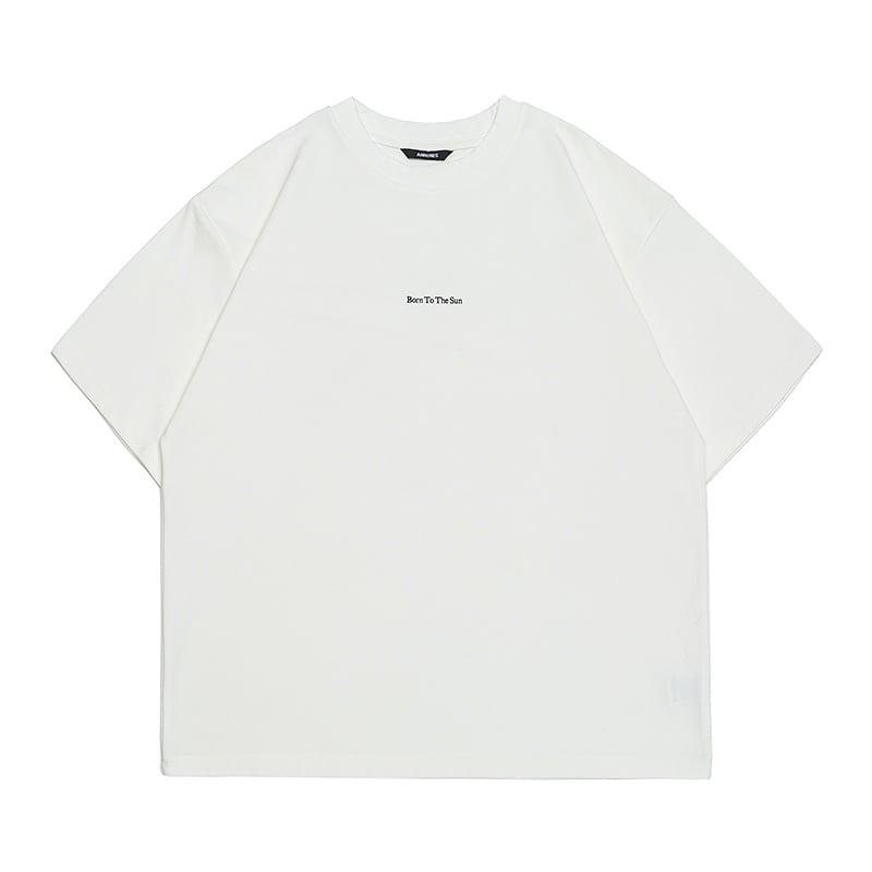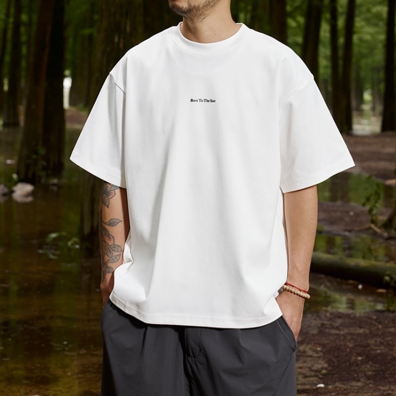 胸元のさりげないレタープリントが、洗練されたアクセントになっています。