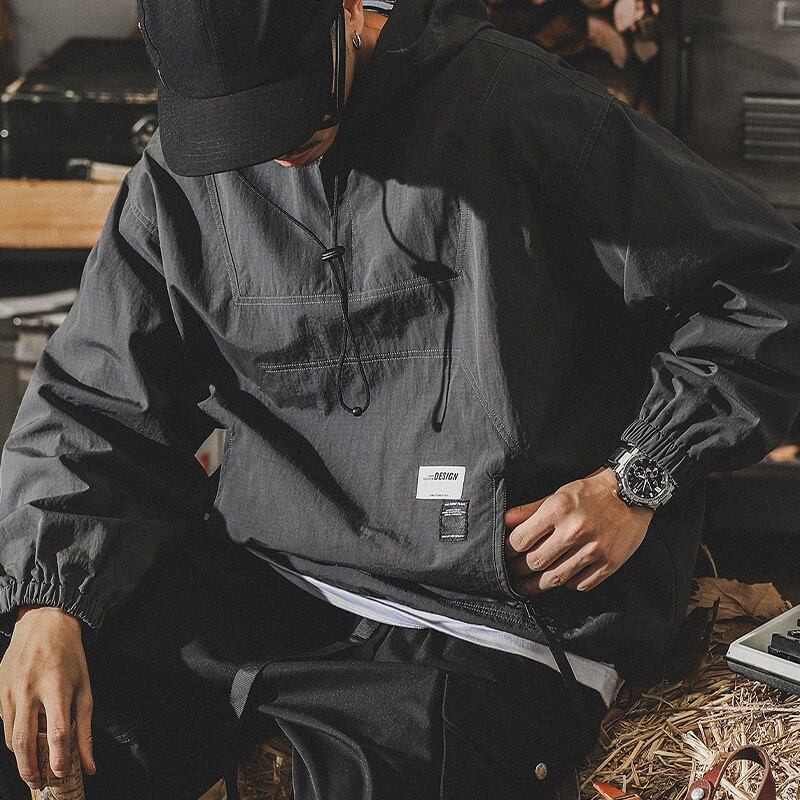 機能性とデザイン性を兼ね備えたハーフジップフード付きプルオーバーパーカーです。