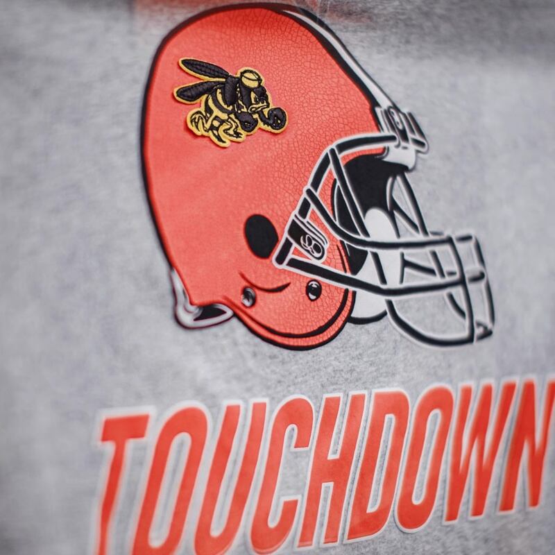 赤いフットボールヘルメットのプリントには、チームマスコットの蜂のエンブレム刺繍が!