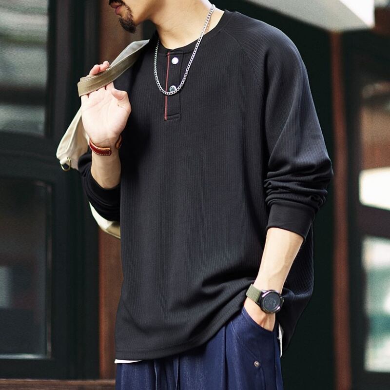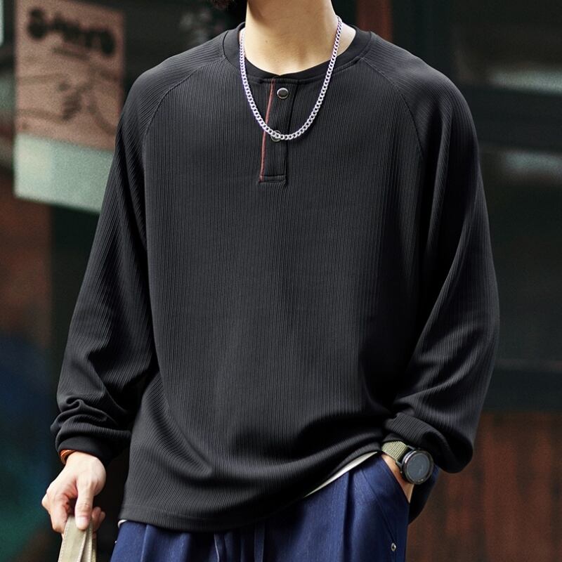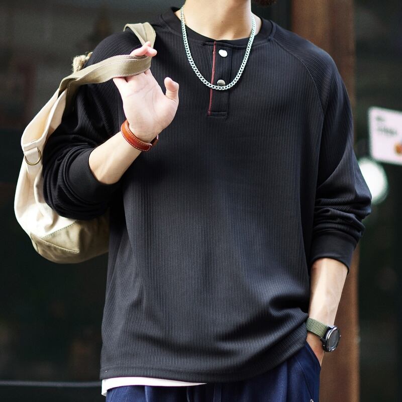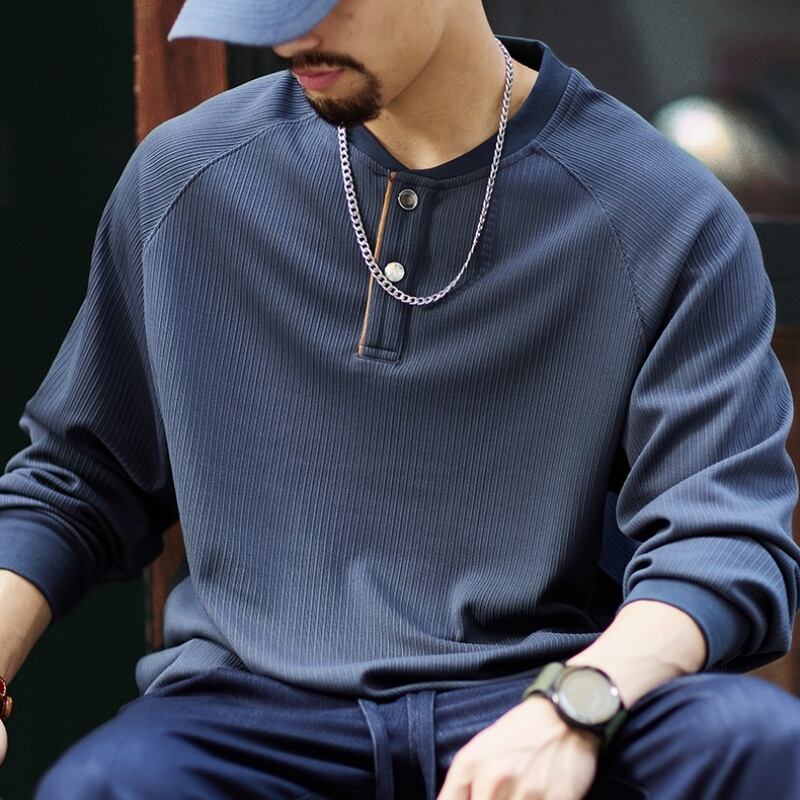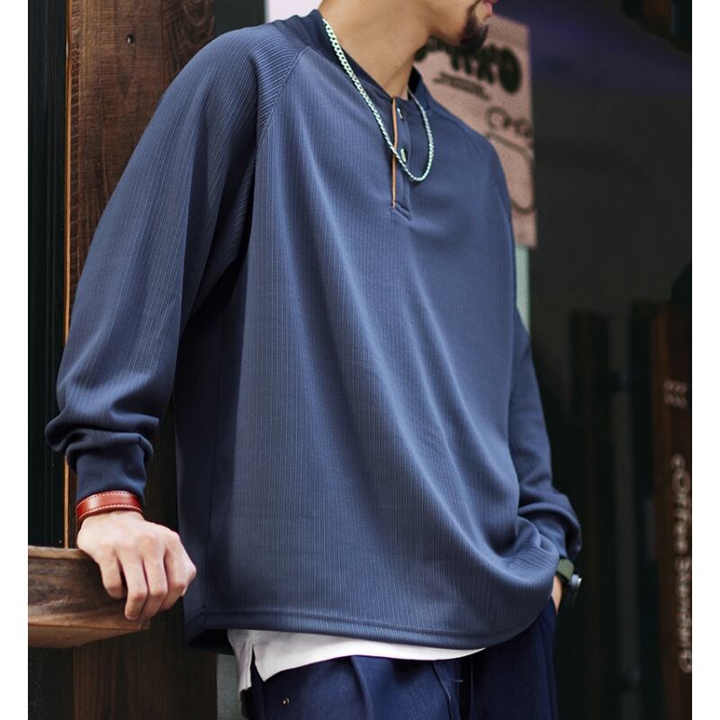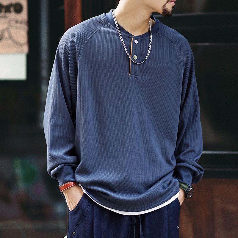 ラグランスリーブのゆったりとしたシルエットが、着心地抜群のヘンリーカラーTシャツです。