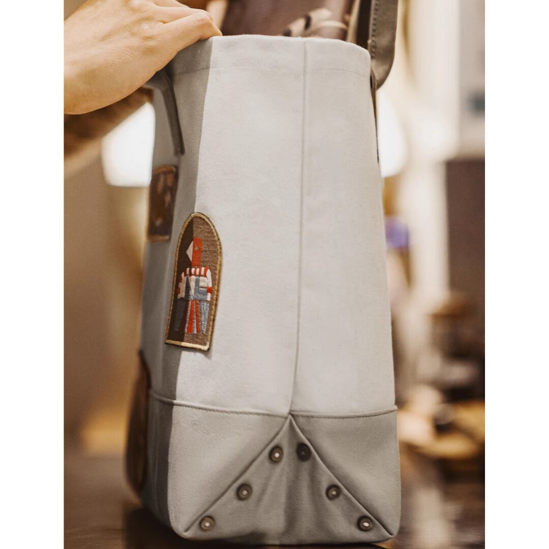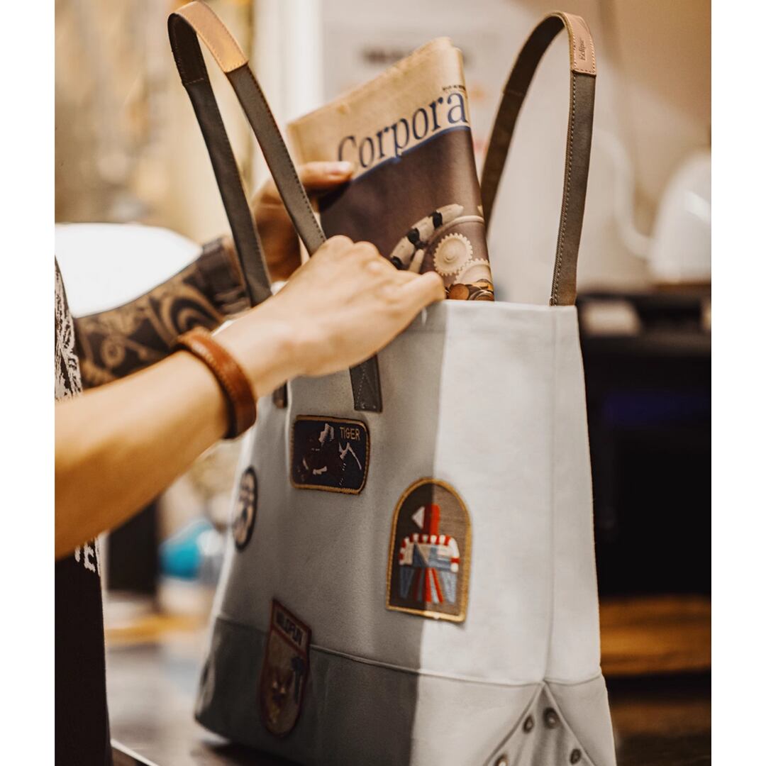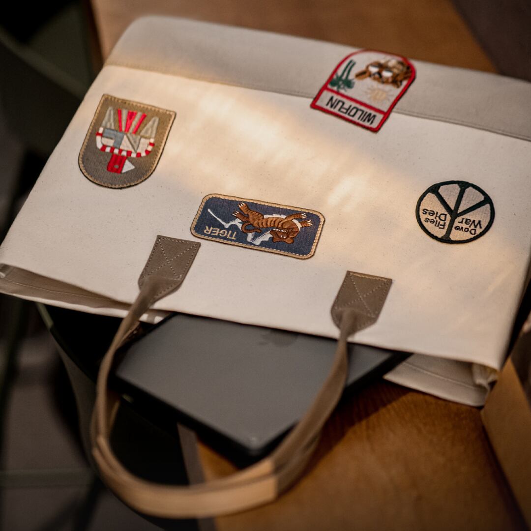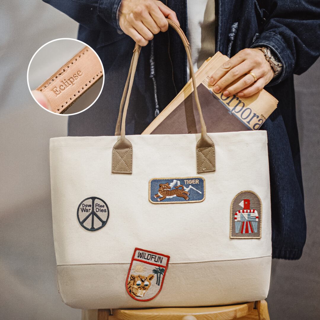 トップハンドル仕様で持ちやすくパッチワークデザインとワッペンがアクセントになっています。