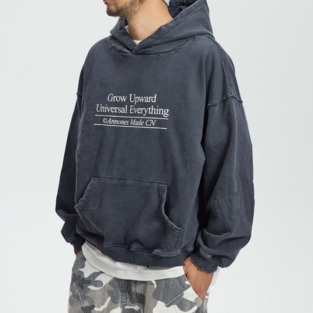 こなれたダメージ加工が魅力のプルオーバーパーカー。程よくゆったりとしたドロップショルダーデザインで、リラックス感あふれる着心地を実現しました。胸元に施されたシンプルなロゴプリントが、さりげないアクセントになっています。カジュアルなスタイルに合わせやすく、デイリーユースに最適な一枚です。