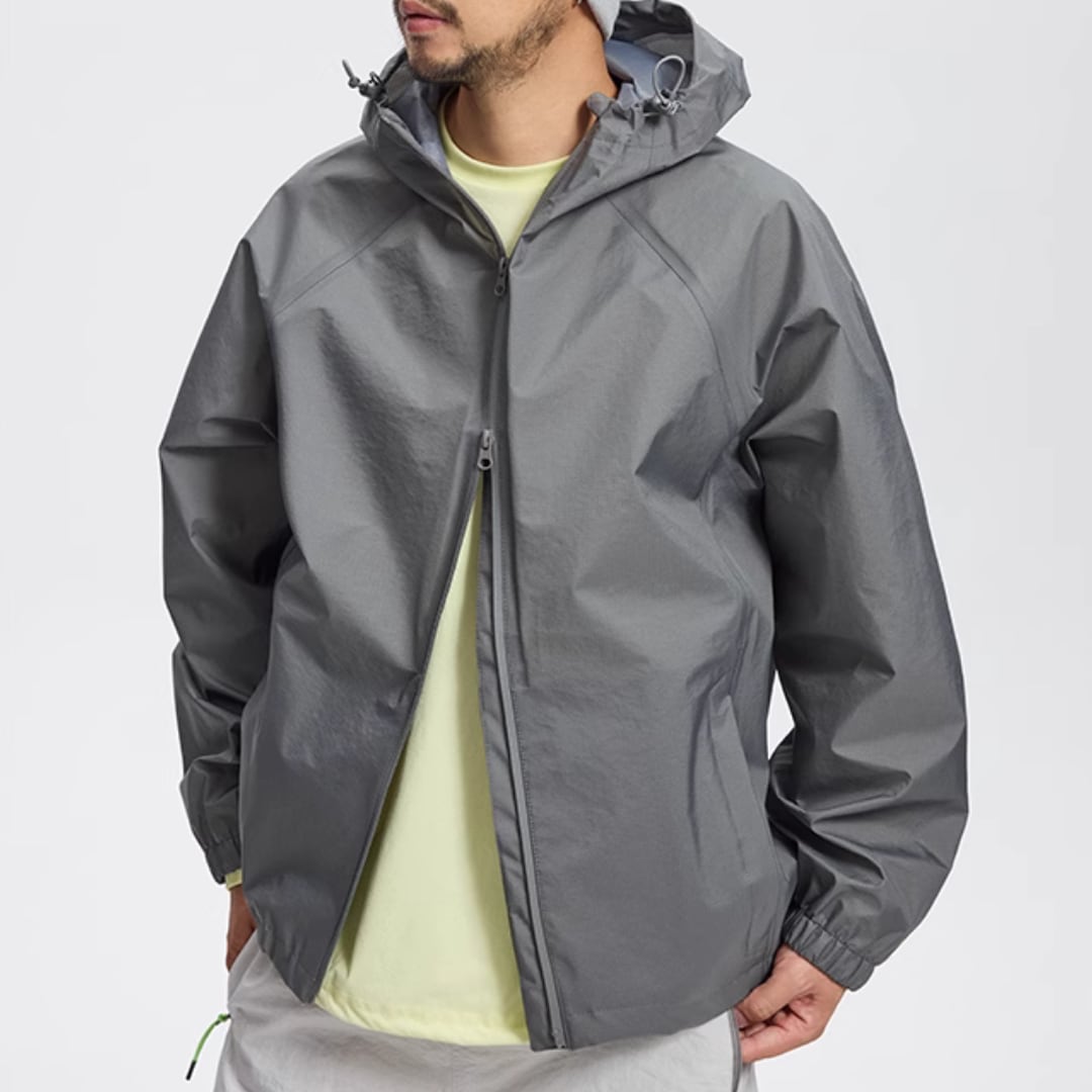 スタンドカラーとフードが特徴的なフルジップアップパーカー。