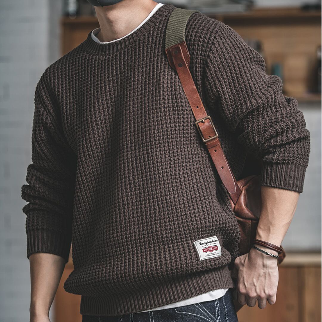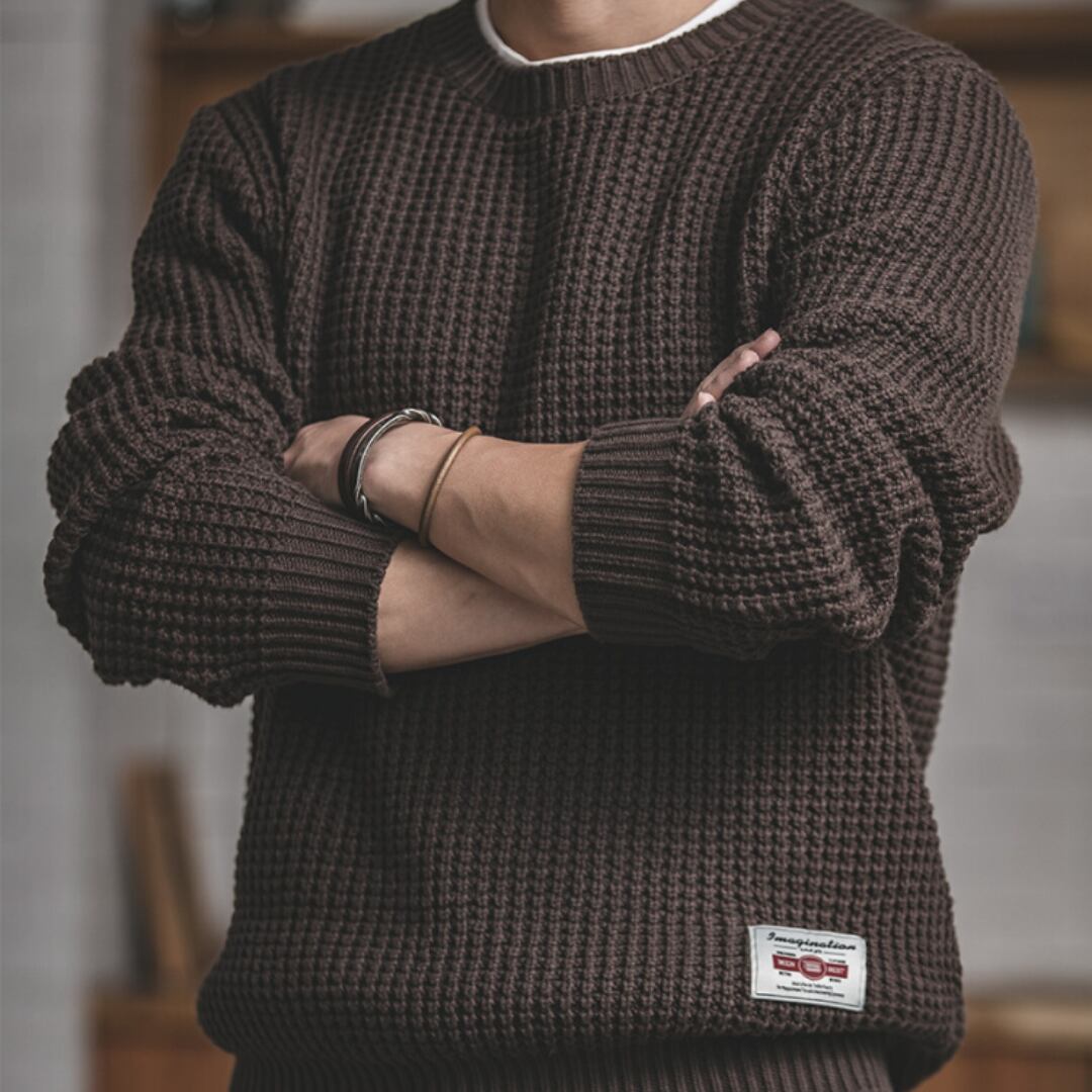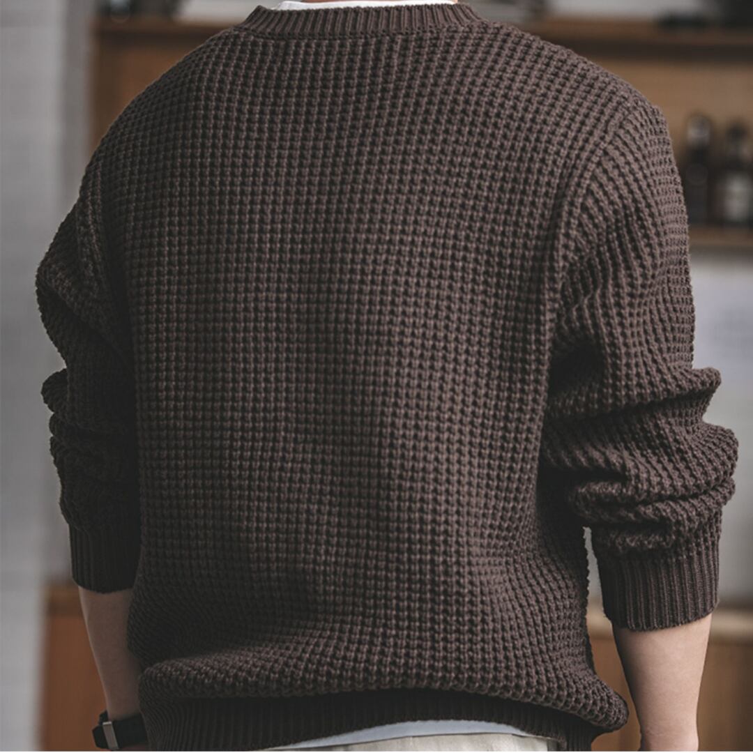 長く愛用できるクルーネックのワッフルニットセーター。