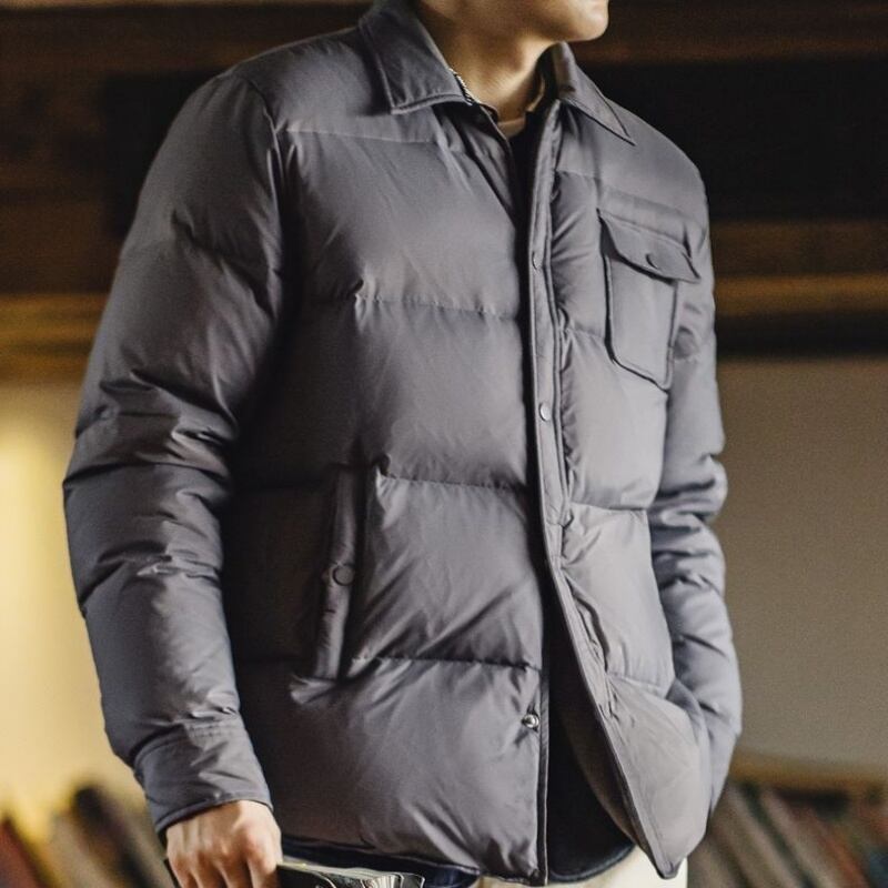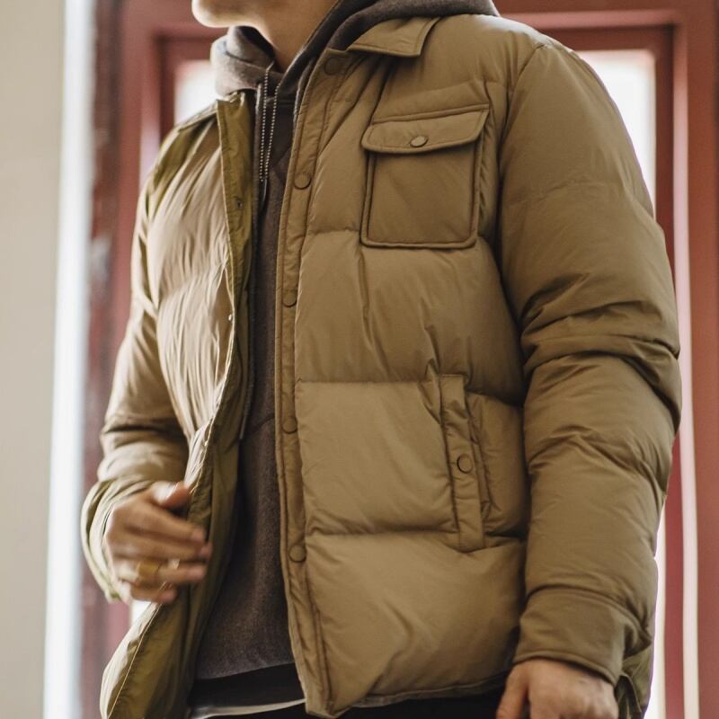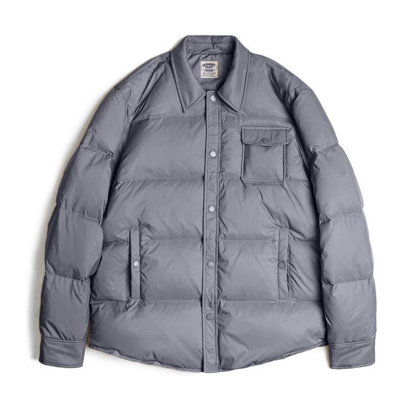 ボタンダウンシャツのようなデザインが特徴的な中綿入りジャケットです。