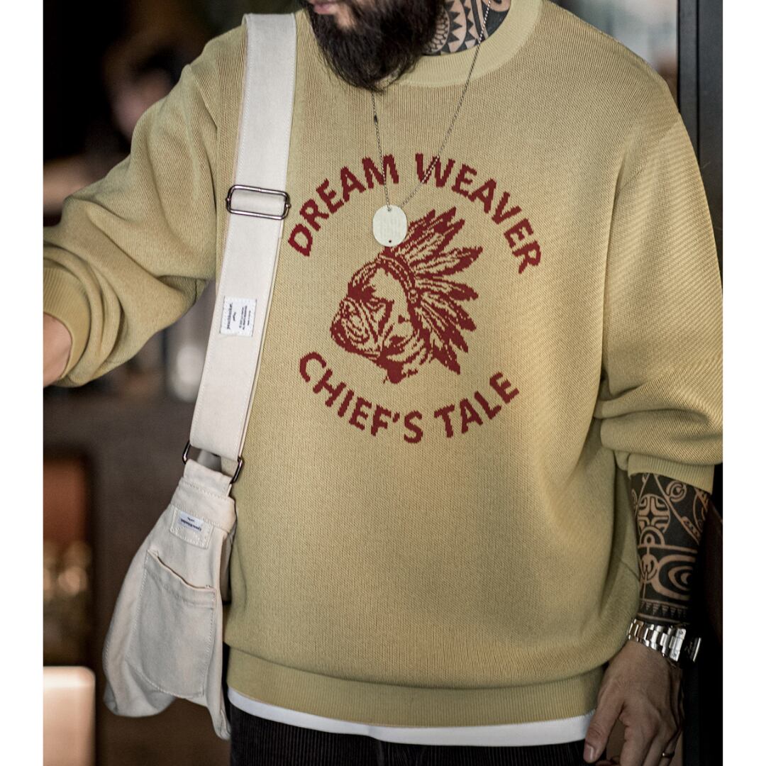 一枚のインディアンの頭像が目を惹く、長袖クルーネックニット。