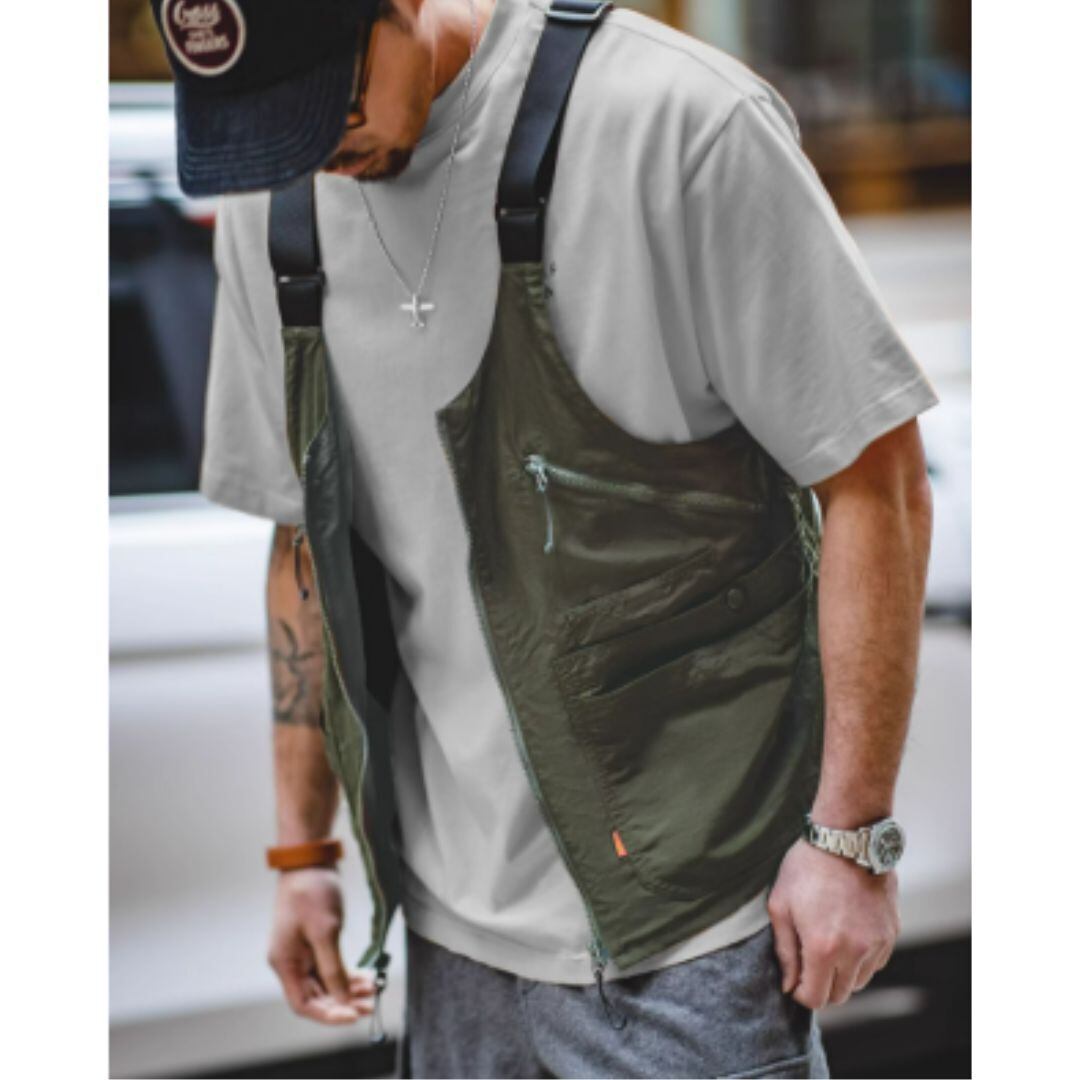 肩掛けストラップ付きのフロントジッパーベストは、普段使いからアウトドアまで幅広く活躍するアイテムです。ジッパー付きのポケットは、小物収納に便利です。シンプルながらも機能的なデザインで、様々なスタイルに合わせやすく、着回し力も抜群です。