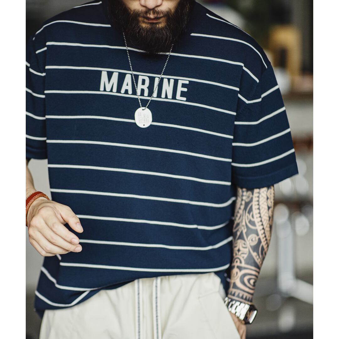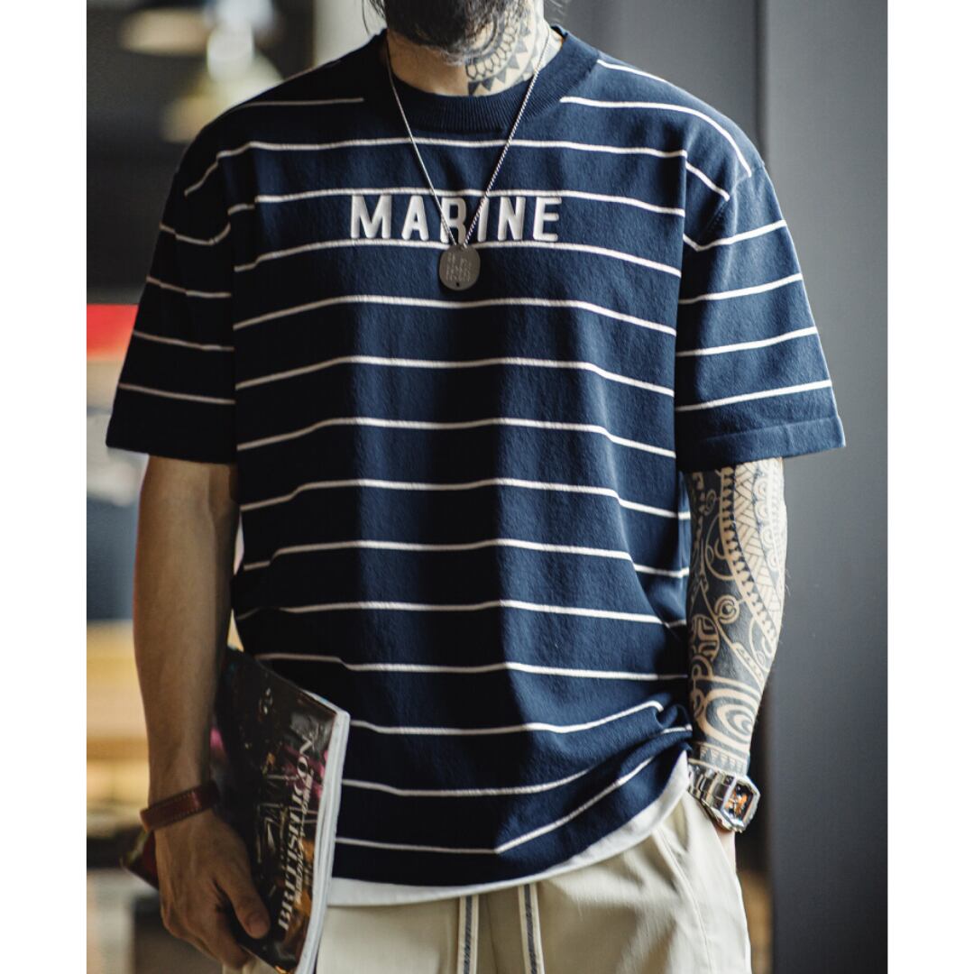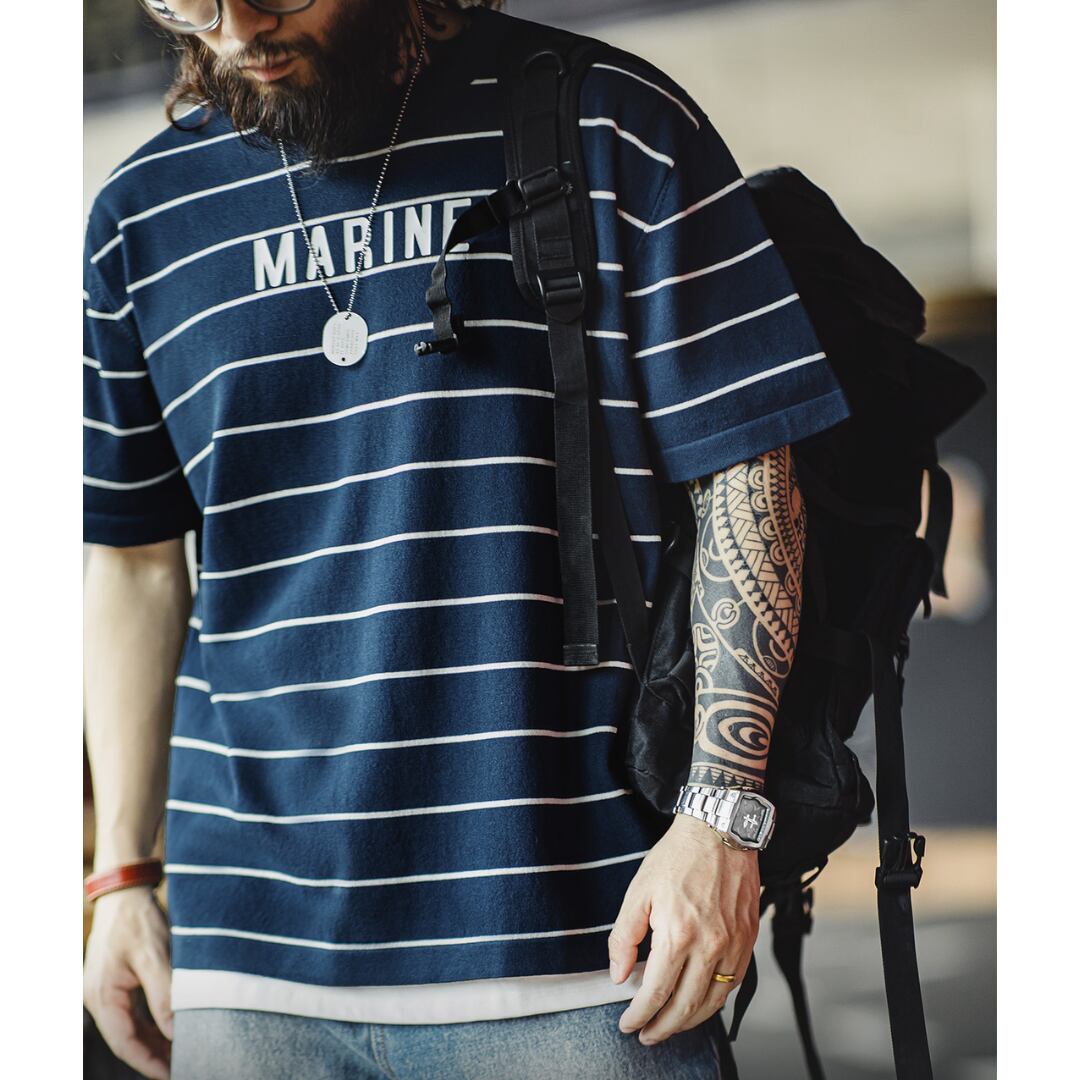 カジュアルなボーダー柄に、胸元のさりげないロゴがアクセントになっています。