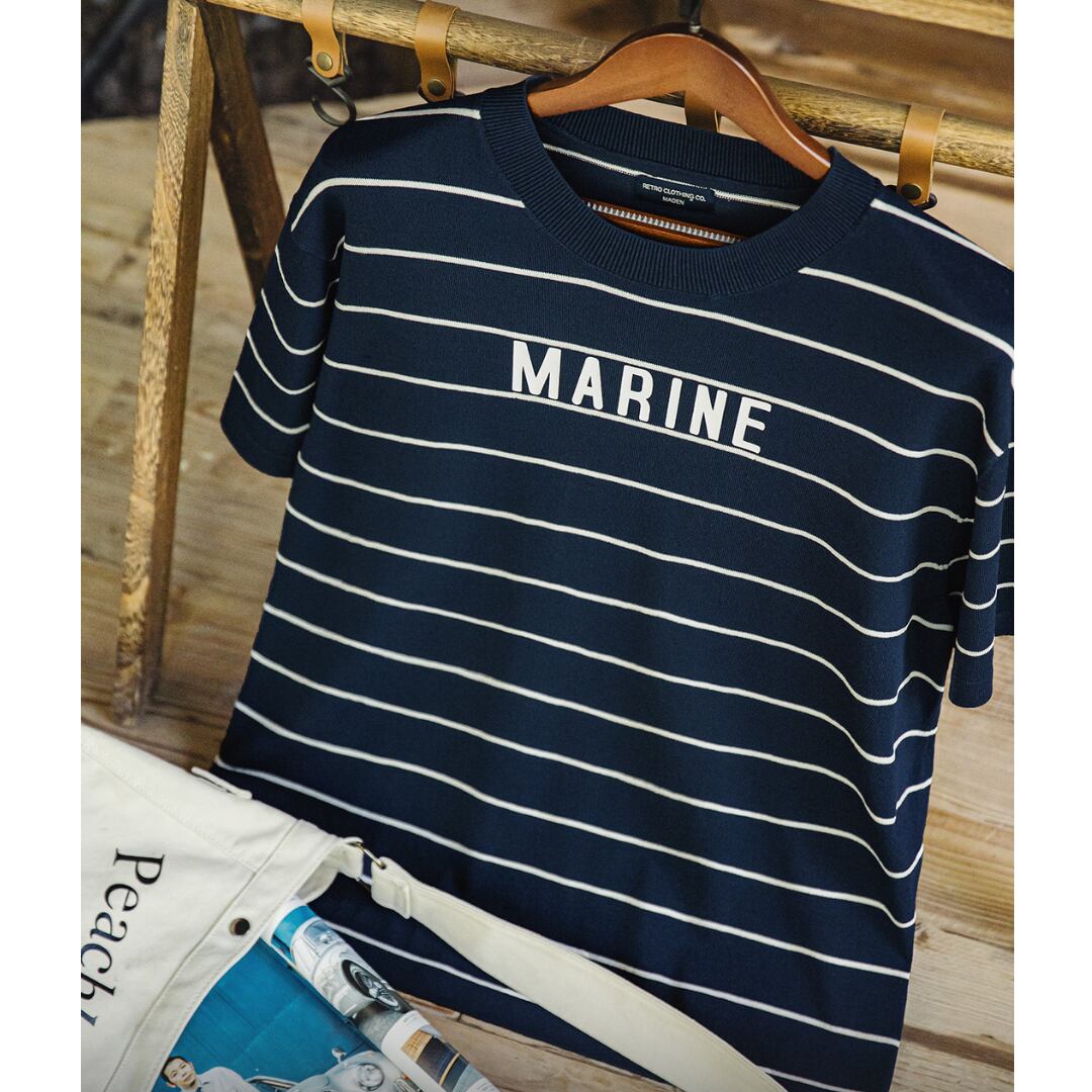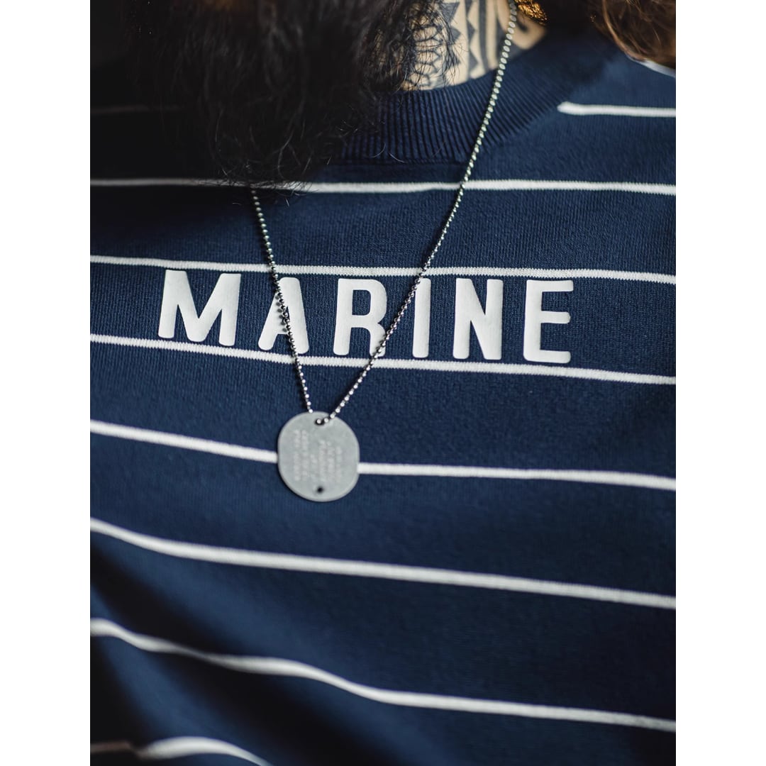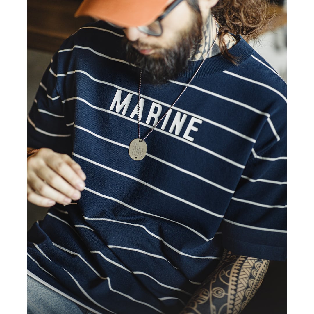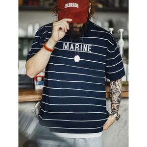 カジュアルなボーダー柄に、胸元のさりげないロゴがアクセントになっています。