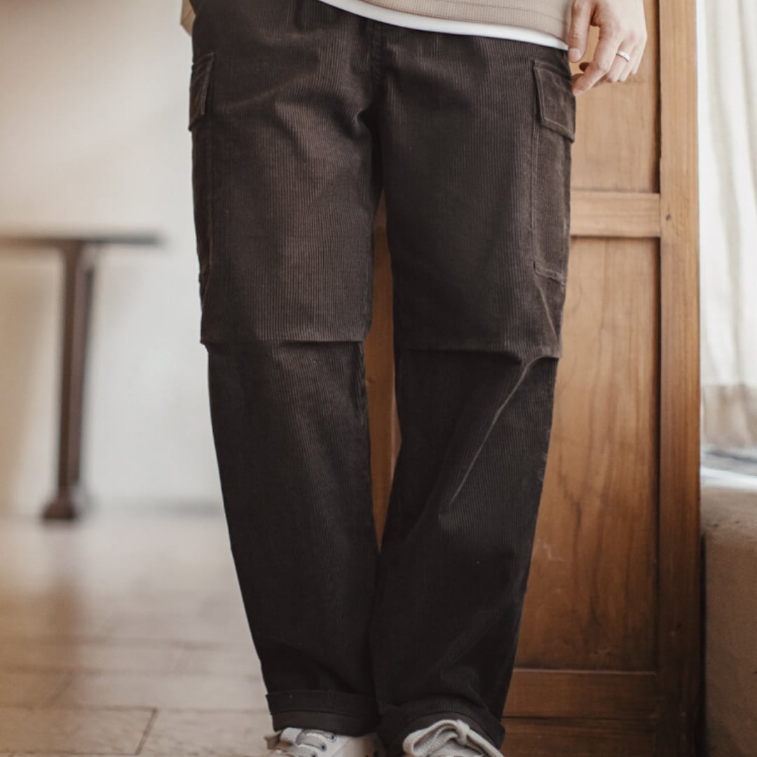 ゆったりとしたシルエットとカーゴポケットが魅力のワイドパンツ。コーデュロイ素材が秋冬らしい温かみのある雰囲気を演出します。カジュアルなスタイルからきれいめスタイルまで、幅広いコーディネートに活躍します。普段使いはもちろん、休日の外出やショッピングにもおすすめです。