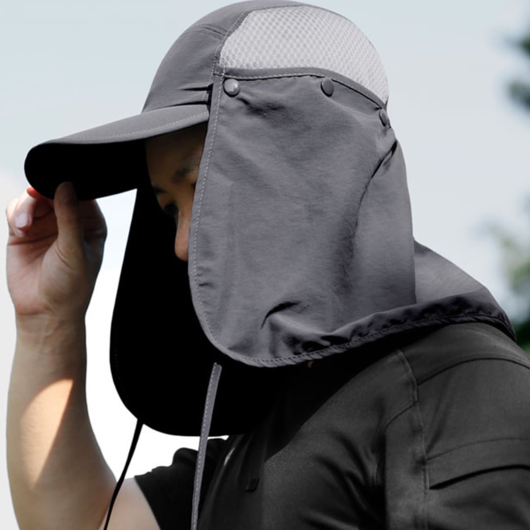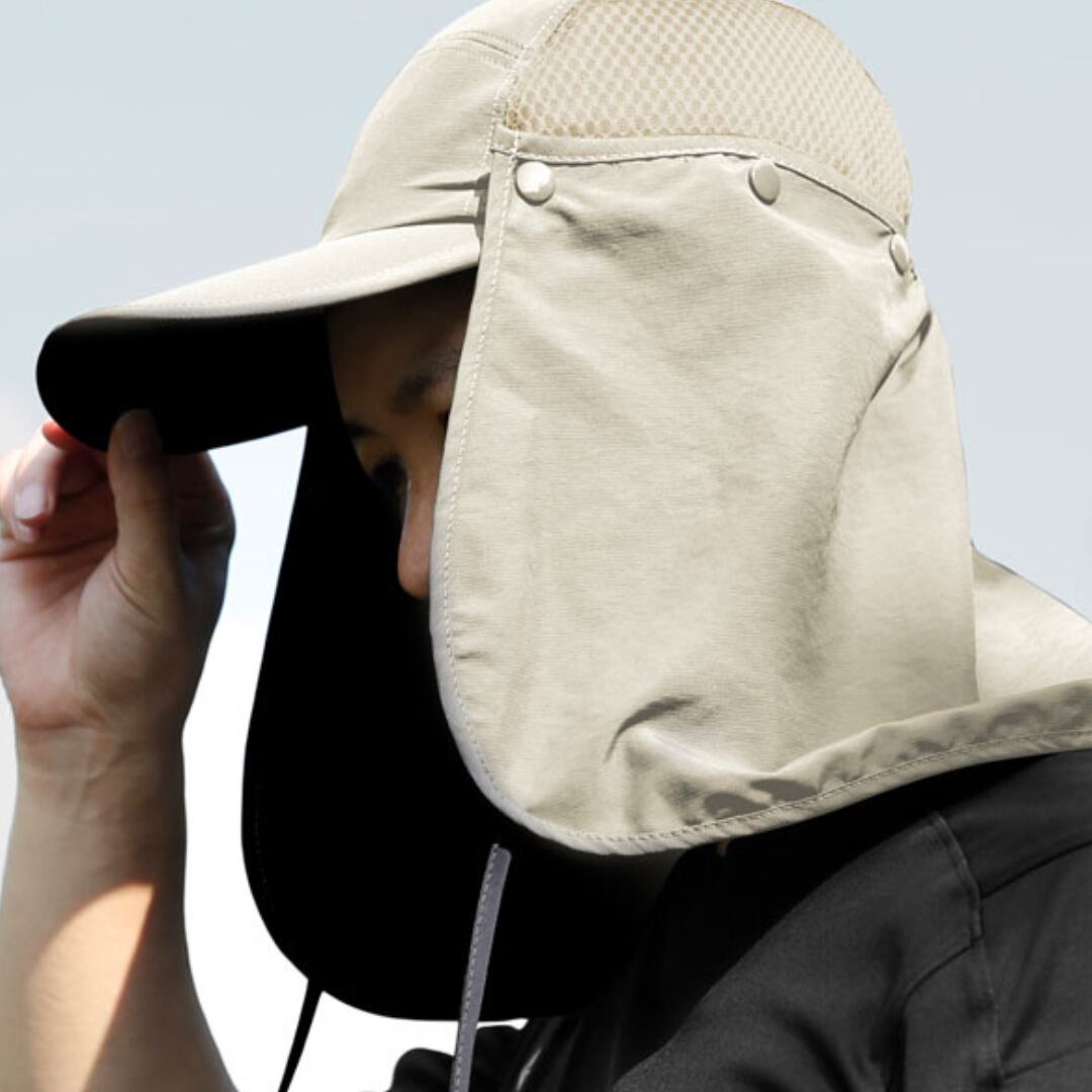 日差しをしっかりガード!メッシュパネル付きサンバイザーキャップとネックカバーが一体になったこのアイテムは、アウトドアシーンに最適です。キャップは通気性の良いメッシュパネルを採用し、ムレを軽減。首元までしっかりカバーするネックカバーは、紫外線や日焼けから肌を守ります。釣り、ハイキング、ガーデニングなど、様々なアクティブシーンで快適さを提供します。