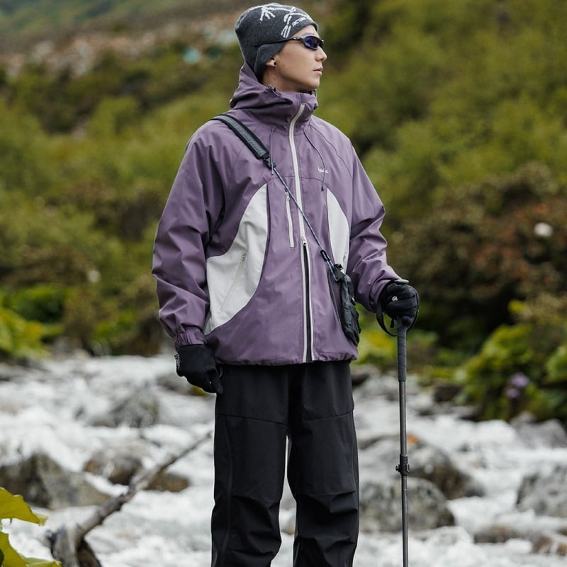 アウトドアシーンに最適な、防水防風フード付きダブルジップジャケットです。