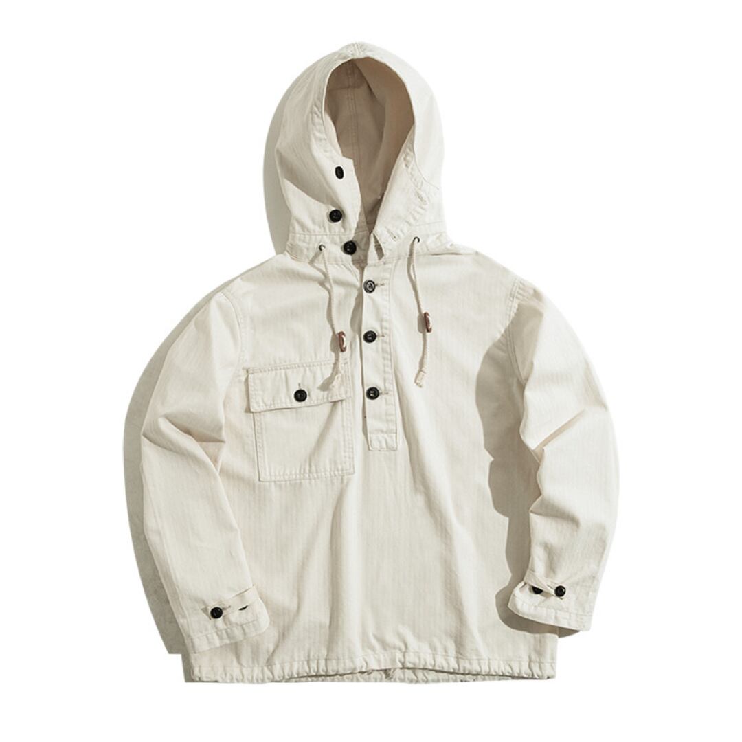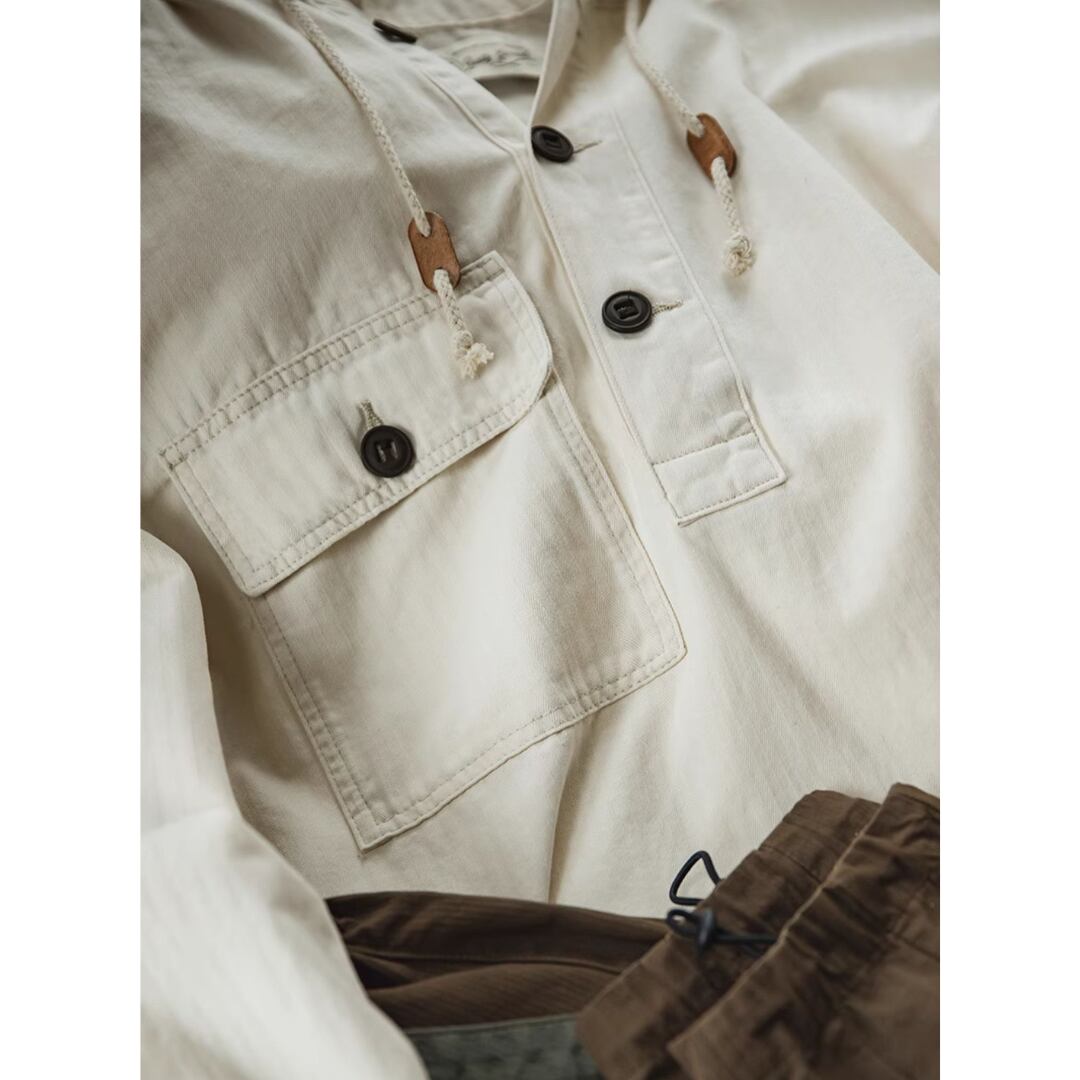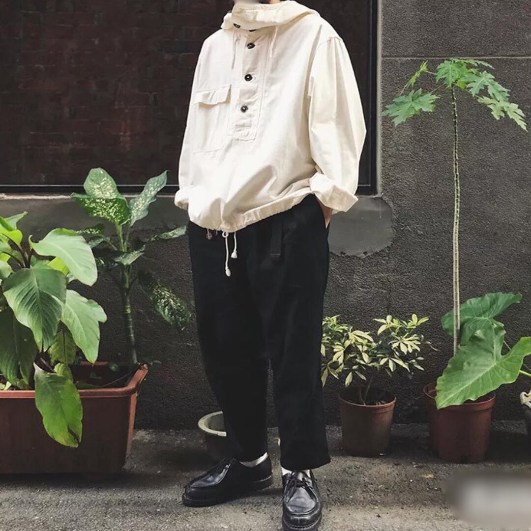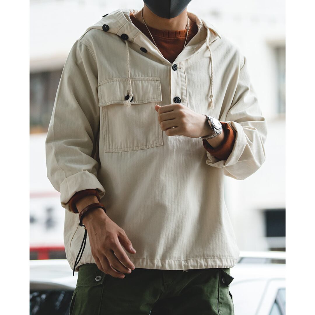 フード付きプルオーバーパーカーシャツは、スタンドカラーとアノラックパーカーのデザインを融合させた、着回し力の高いアイテムです。程よくゆったりとしたシルエットで、リラックスした着心地を実現。