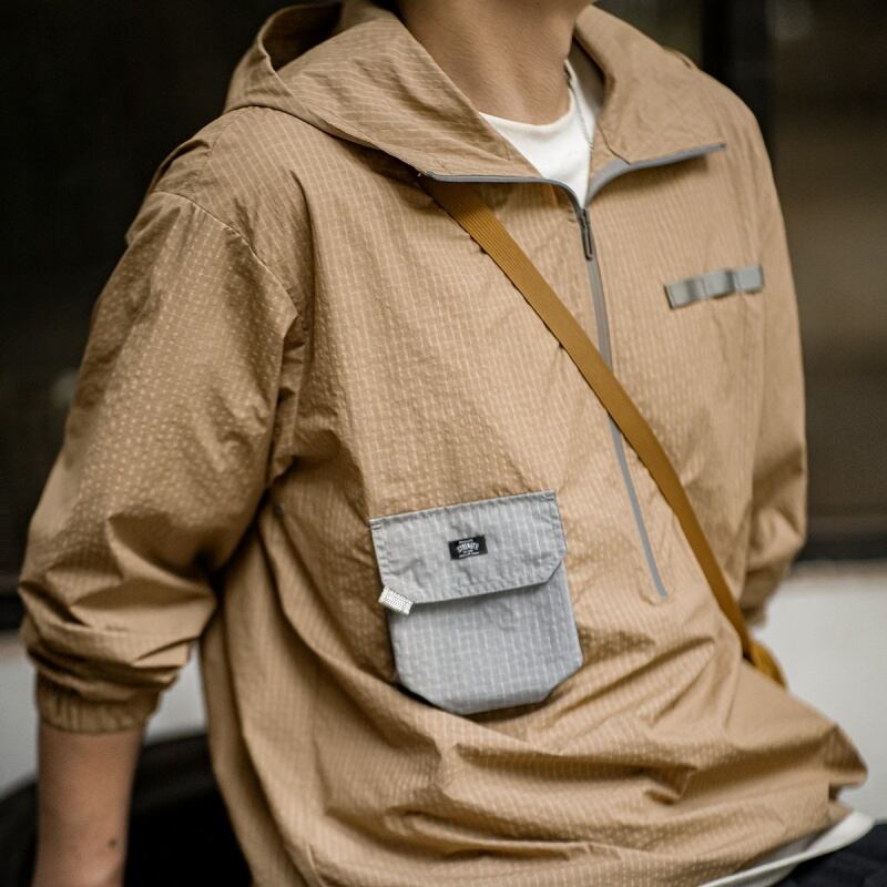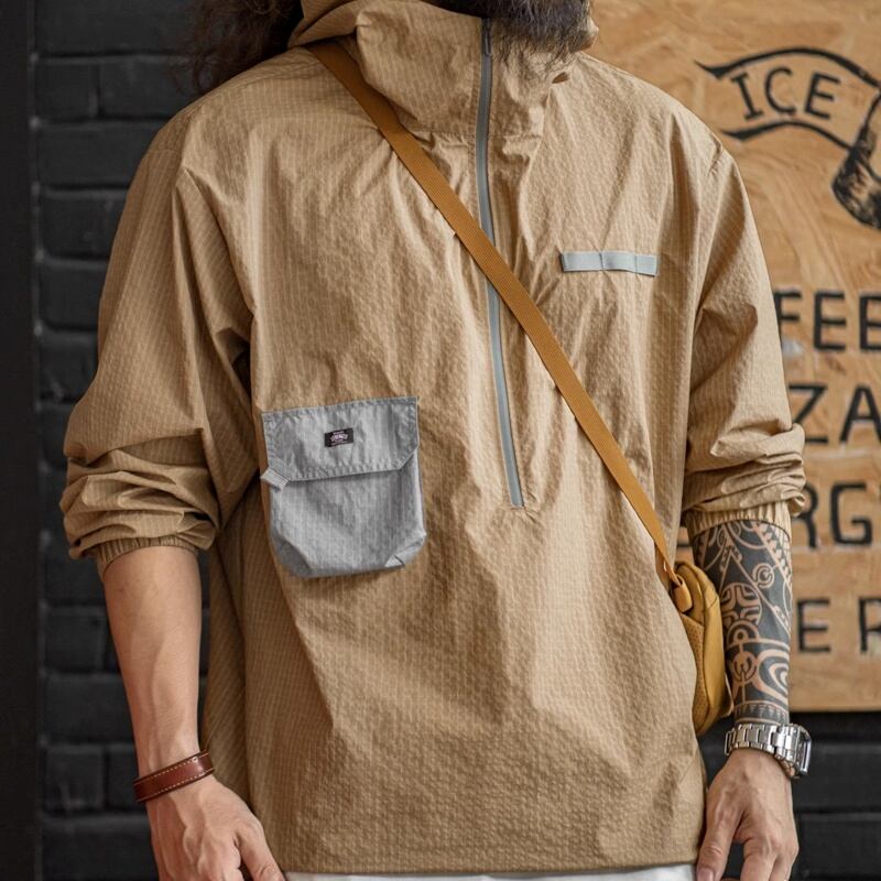 ハーフジップスタイルのフード付き薄手プルオーバーです。