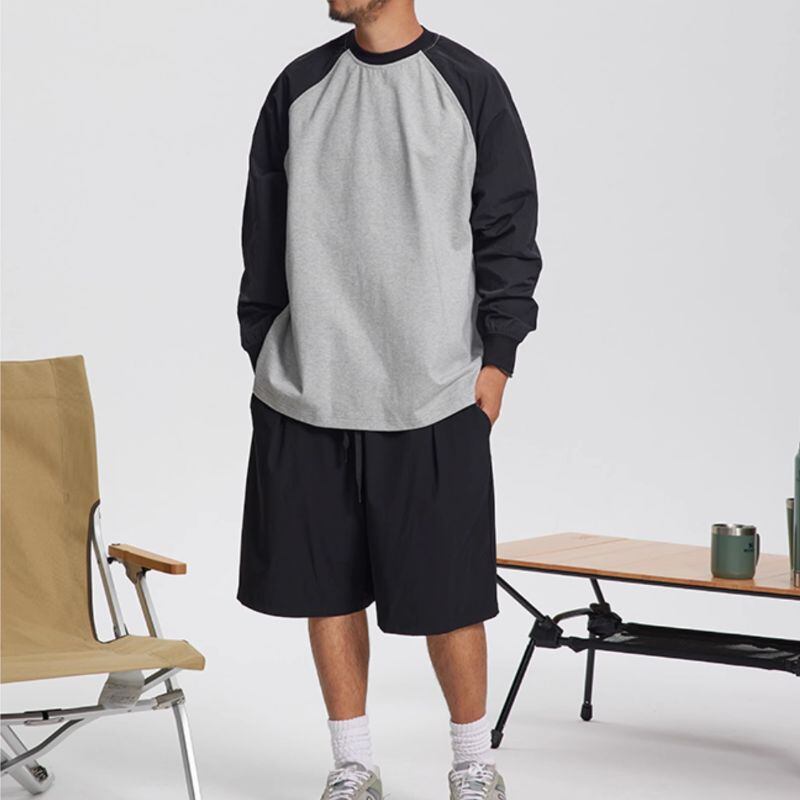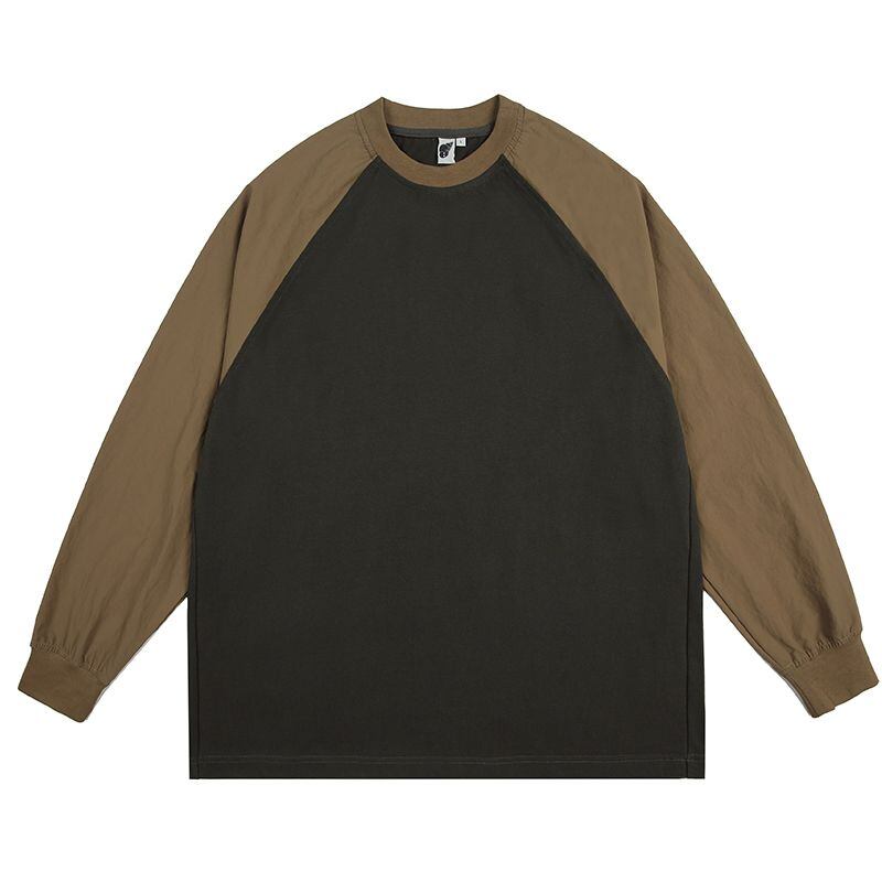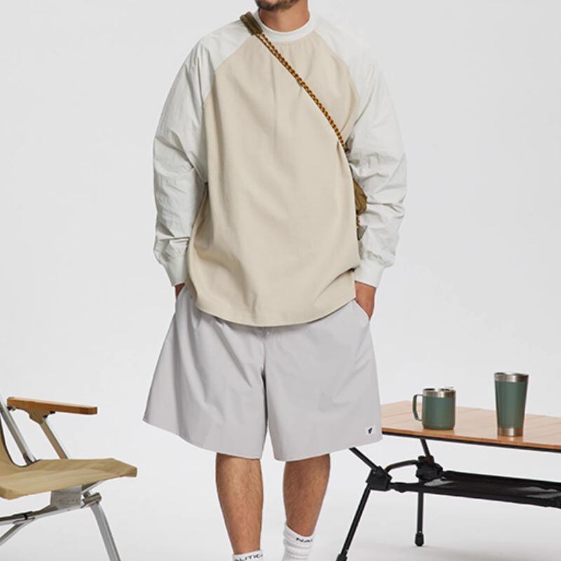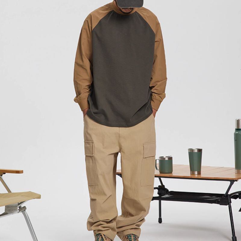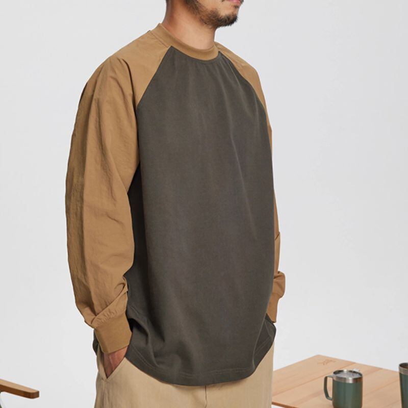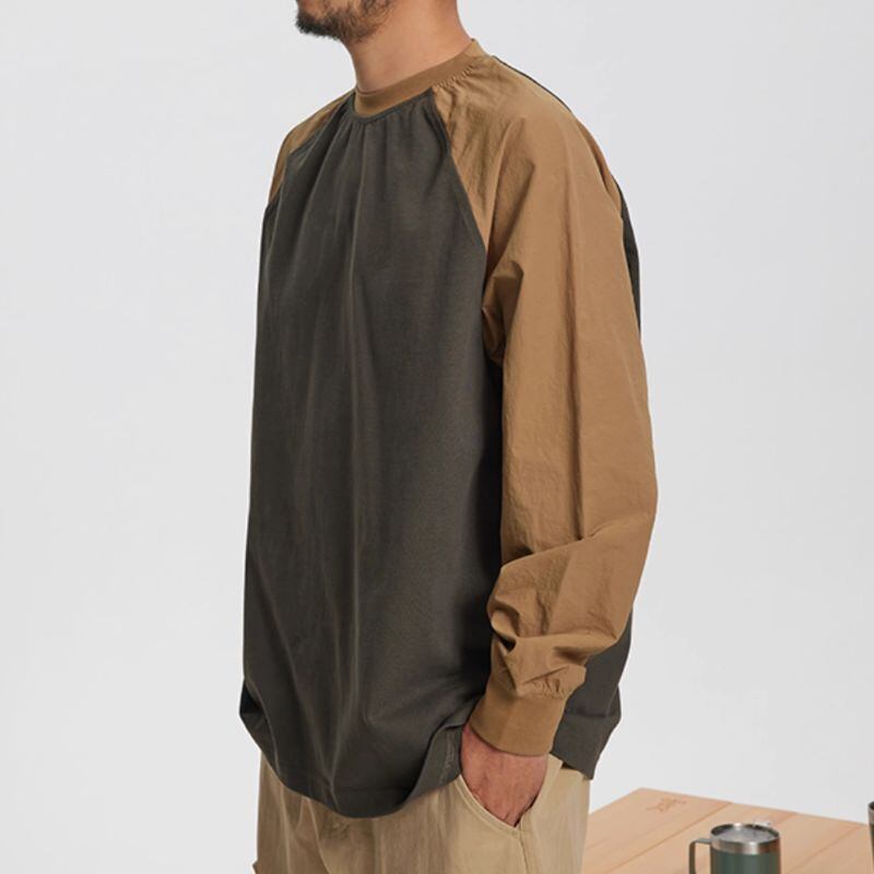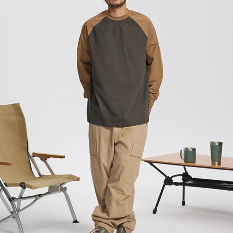 配色切替が目を惹く、ラグランスリーブクルーネック長袖Tシャツ。オフホワイトとベージュの組み合わせが、洗練された印象を与えます。シンプルなデザインながら、ラグランスリーブと配色切替が、着こなしにさりげないアクセントをプラス。普段使いはもちろん、カジュアルなシーンにも活躍します。