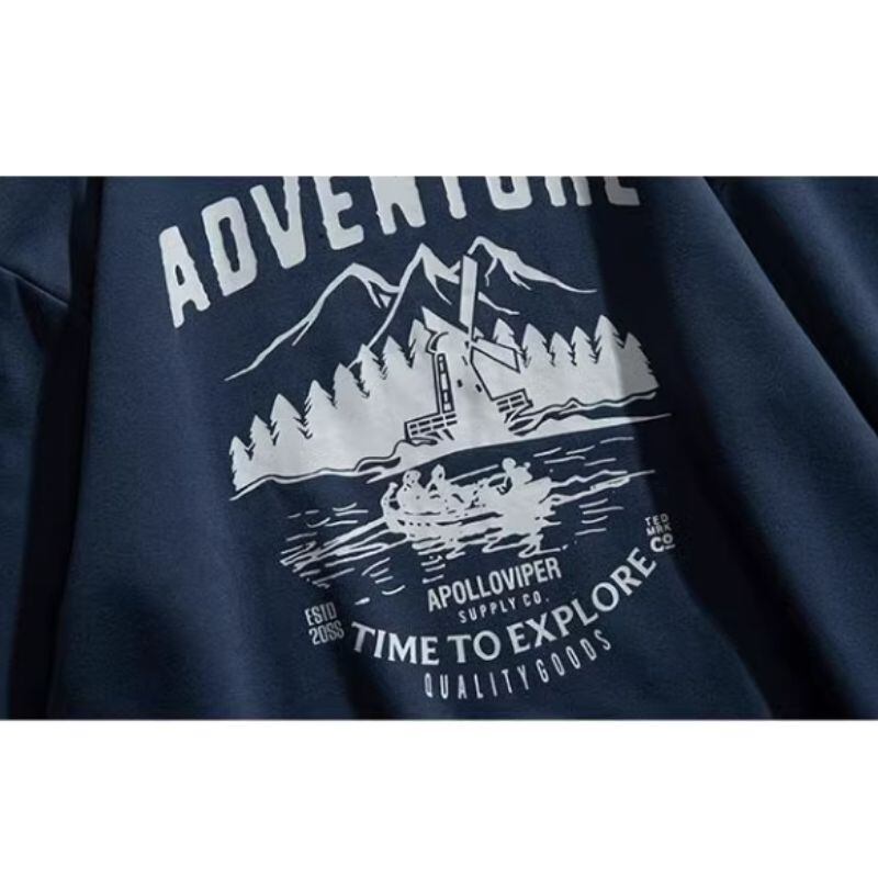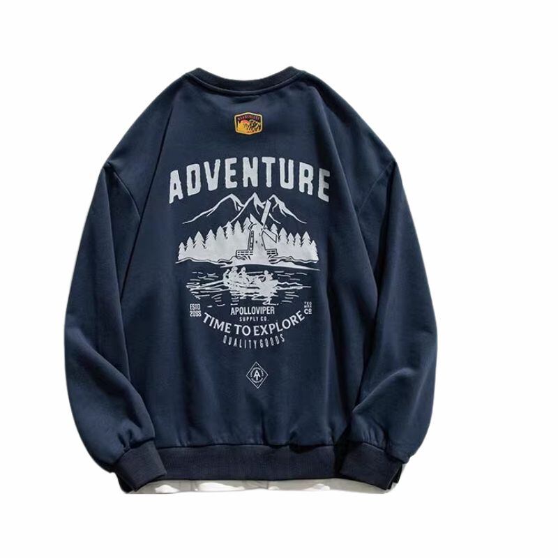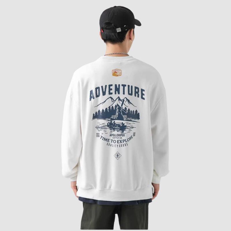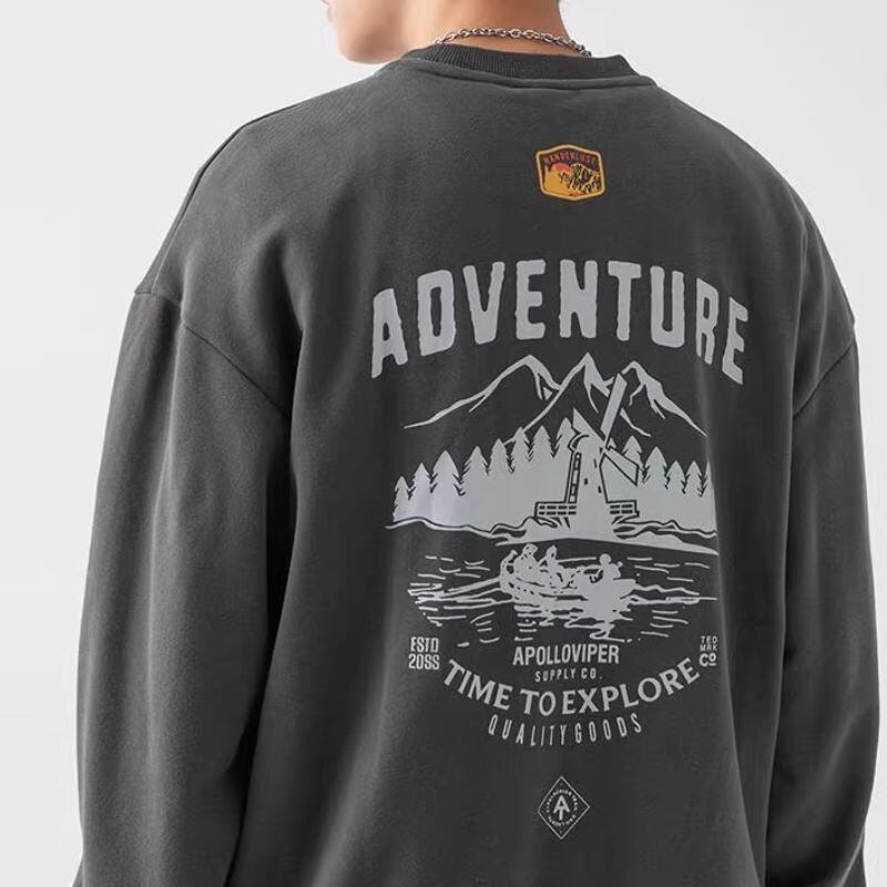 バックプリントに「ADVENTURE」の文字と、湖でボートを楽しむ人々のイラストがデザインされたオーバーサイズクルーネックスウェットシャツ。