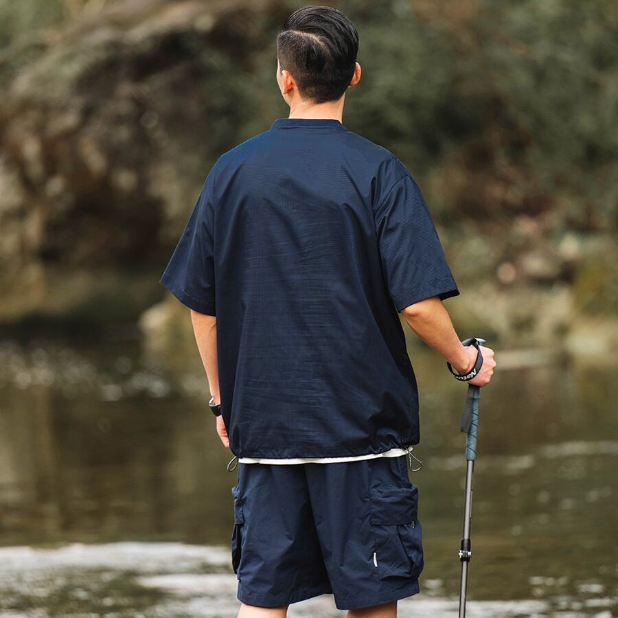 隠れたジッパーがアクセントになった、着心地抜群の五分袖Tシャツです。
