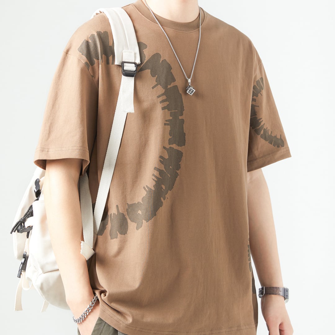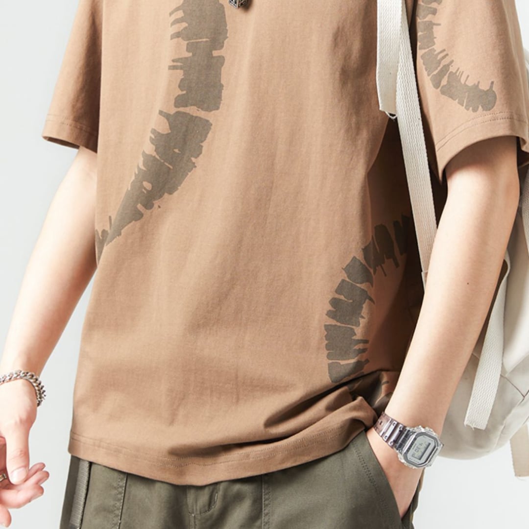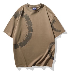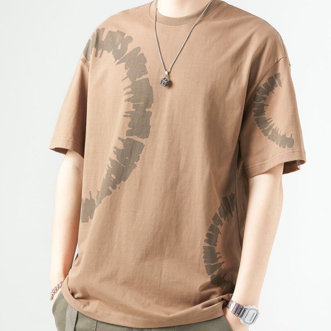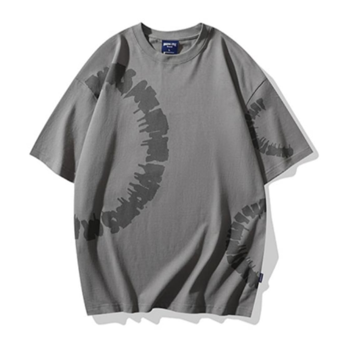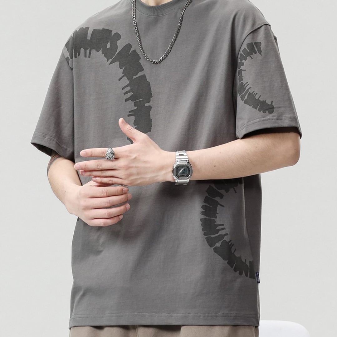 抽象的なグラフィックプリントが目を引く、オーバーサイズのボックスシルエットTシャツです。