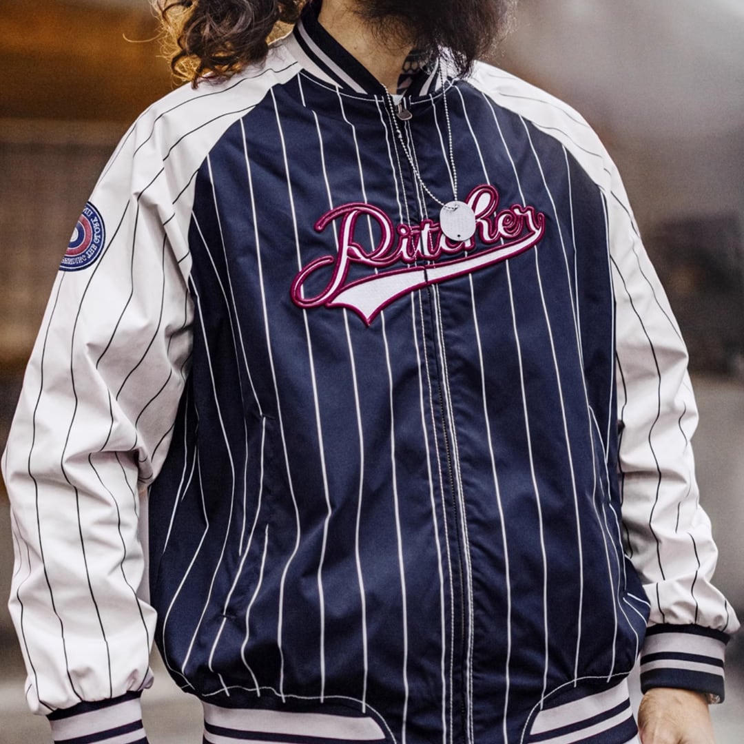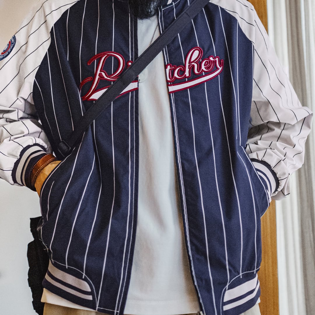 スタイリッシュなスタンドカラーと、クラシックなストライプ柄の刺繍が魅力のベースボールジャケット。程よくゆとりあるシルエットで快適な着心地を実現しました。様々なボトムスと合わせやすく、デイリーユースに最適です。